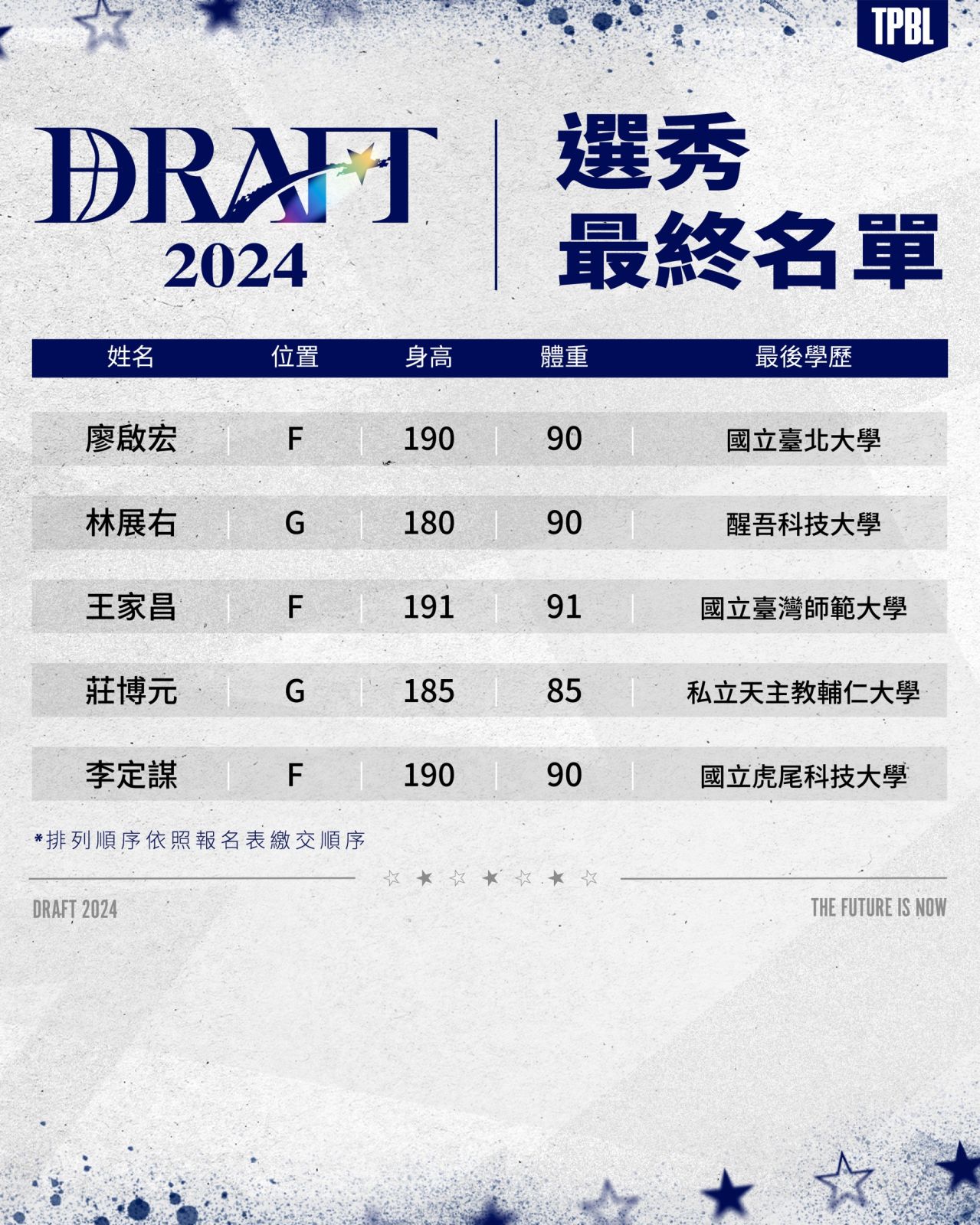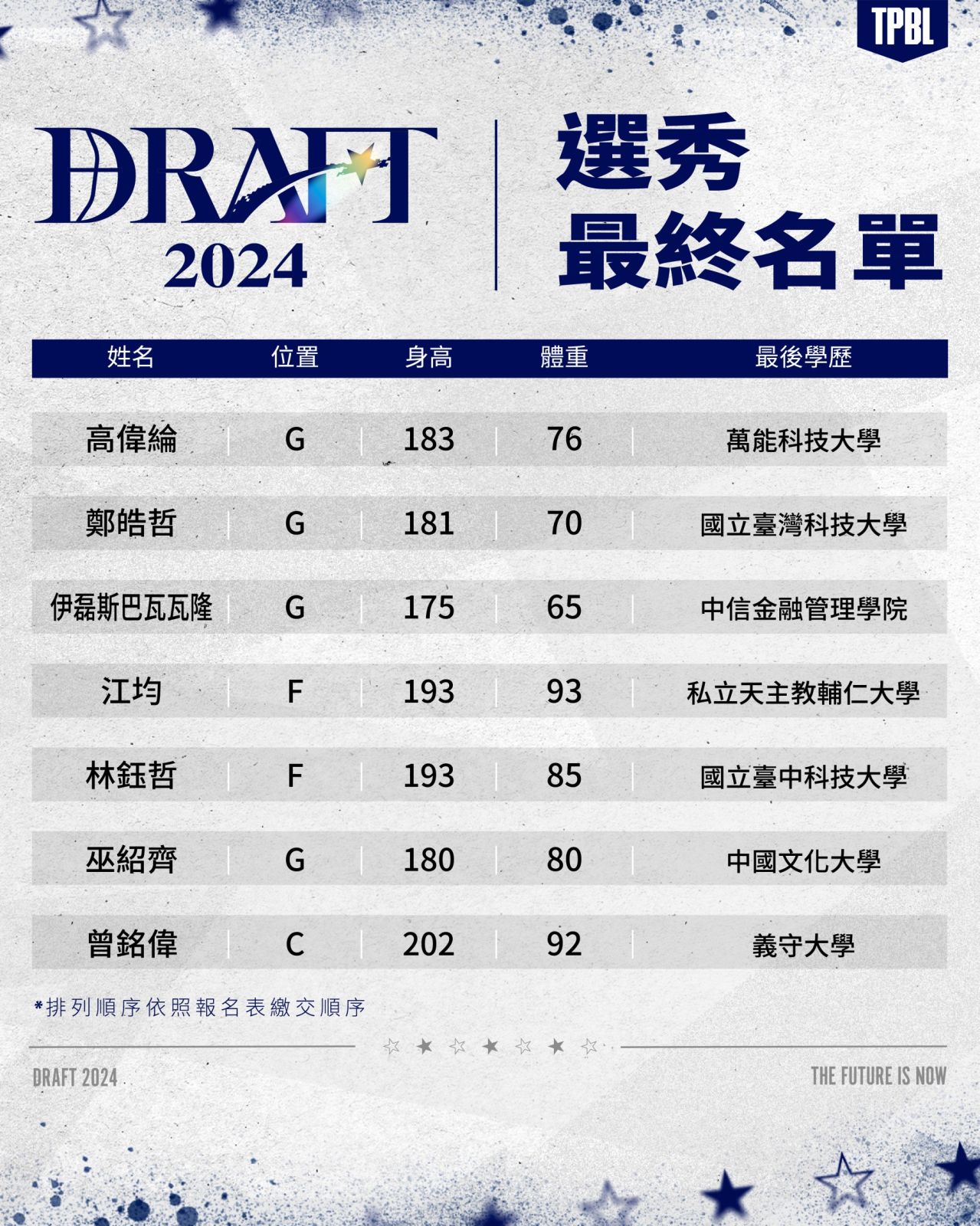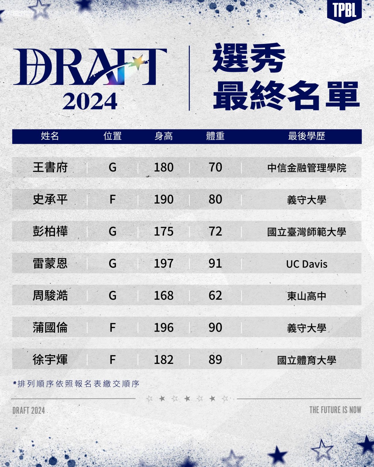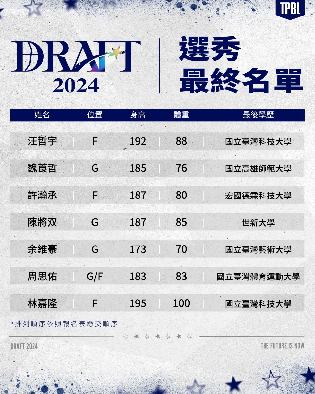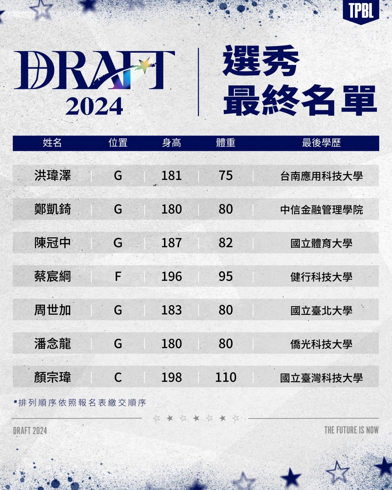 今天TPBL公布2024年選秀大會最終選秀名單,共有33名新星投入首屆TPBL選秀會,而其中陳力生、張志豪、林心翔、李允傑、王凱裕、莊朝勝與朱育君等7名球員於截止時間前撤銷選秀申請,其中七位皆在PLG選秀會上被選中。