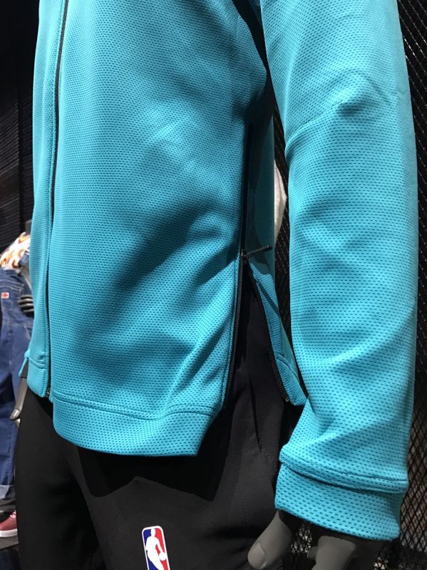 首先是連帽部分使用特殊的網狀材質,主要原因就是讓球員戴著連帽賽前熱身時,同時能聽聞教練的指令與戰術下達,球員間的溝通也更為順利。另外相較於以往熱身服都存在的阻礙性,本次在側邊的下襬部分則做出剪裁,有效提升球員穿著外套時的靈活性。
