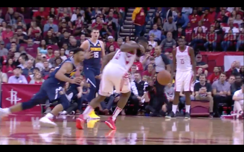 在今天火箭對陣金塊的比賽中,第二節後半段,火箭球員James Harden在一次進攻當中先是背運晃倒了金塊主力球員Jamal Murray,隨後打成3+1。