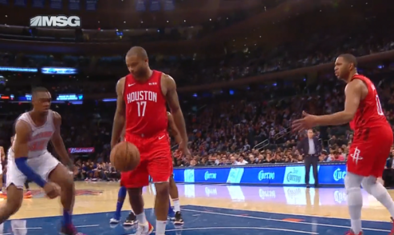 尼克主場對火箭第四節最後關鍵時刻,火箭前鋒P.J. Tucker 不接底線發球造成失誤,尼克前鋒Noah Vonleh抄截得到關鍵兩分。