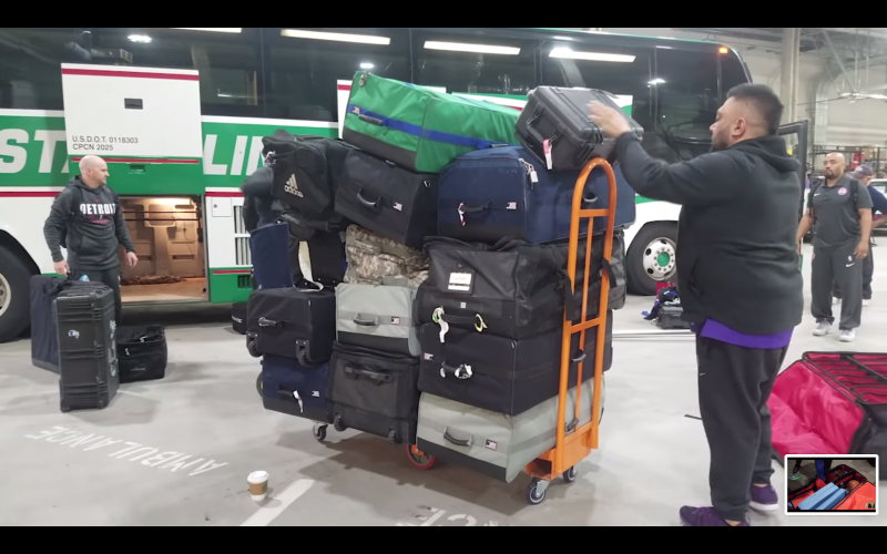 在早晨的投籃訓練期間,從球員,到體能訓練師,到錄像和醫療工作人員,到福克斯體育的底特律轉播團隊的每一個人都會把他們的行李交給裝備經理放到卡車上。卡車會把所有的旅行包從位於奧本山的球隊訓練基地運送到底特律市區的主場。當然了,因為比賽安排在晚上,有些行李需要拿下卡車,送到小凱撒球館內,在比賽結束後又馬上放回卡車。