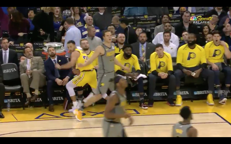 本場比賽由東區第四溜馬對上西區龍頭勇士,開局勇士先發五人手感火燙,到第三節結束五人得分均上雙,其中Curry已經飆進五顆三分球,在第三節初Curry持球在底角進攻,先是瘋狂的胯下運球,隨後接上後撤步三分連續技,球一出手便轉向觀眾席,留下茫然的Bogdanović看著球三分入袋。