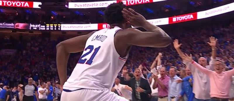 在比賽第四節中段,76人中鋒Joel Embiid三分弧頂處點起防守隊員,順勢殺入內線,一記大風車扣籃,幫助76人以110-84取得領先。扣進此球後,Embiid顯得十分興奮,在場邊做出了76人傳奇Allen Iverson傾聽現場吶喊的招牌慶祝動作。