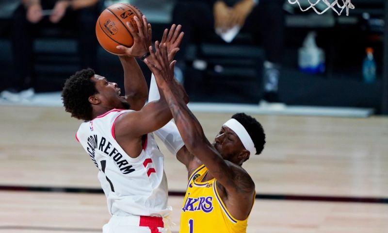 今天暴龍迎來了例行賽復賽後的首場較量,對陣西區領頭羊湖人隊。比賽伊始,暴龍在Lowry和Siakam的帶領下多點開花,連續飆中三記三分,取得13-0的強勢開局。隨後,McGee籃下強打為湖人取得第一分,Pope外線發炮,James突破打成2+1,湖人回敬一波10-2縮小分差。首節結束前,Morris補籃得手,湖人落後2分結束首節較量。次節對決,Waiters裡切外投連得5分幫助湖人反超比分,暴龍則依靠Lowry頻頻突破內線造殺傷重奪領先優勢。本節比賽後半段,雙方打鐵不斷,多次陷入得分荒,湖人憑藉替補球員的出色發揮保持微弱的領先。半場戰罷,湖人44-41領先暴龍,Davis僅靠罰球得到1分。
