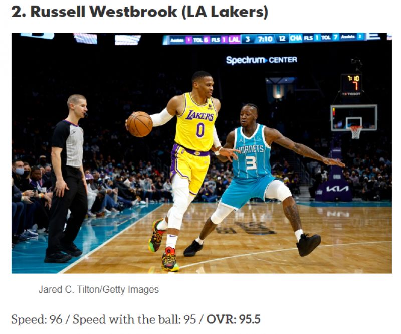 Russell Westbrook以95.5的速度綜合評分排名第二。圖/截自HoopsHype官網