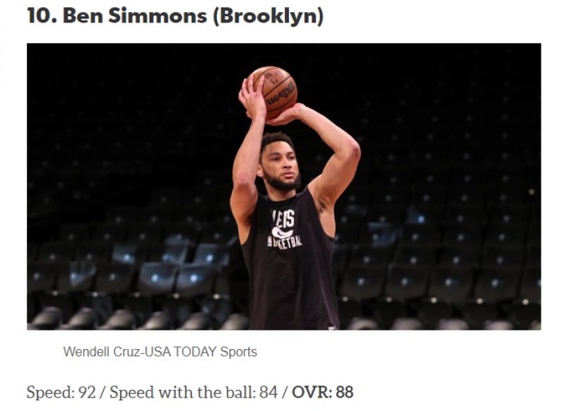 Ben Simmons以88的速度綜合評分排名第十。圖/截自HoopsHype官網