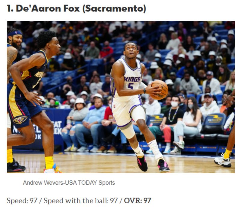 De'Aaron Fox以97的速度綜合評分高居第一。圖/截自HoopsHype官網