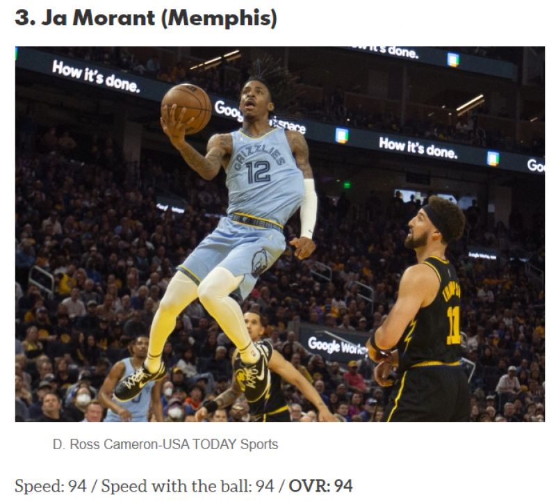 Ja Morant以94的速度綜合評分排名第三。圖/截自HoopsHype官網