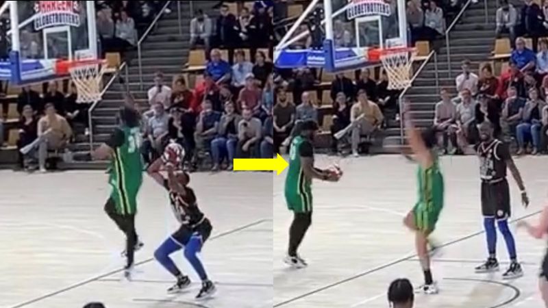 美媒《Overtime》 於近期分享了一則有趣的畫面,在哈林籃球賽的比賽中,一位球員在正在快攻,而他做完假動作後,該對手順勢被騙起身並跳至界外。此時做完假動作的球員將球傳給了被騙起身的球員,後者則將球接起,但因身處在界外,所以球權歸屬仍為前者,後者因此憤而砸球。