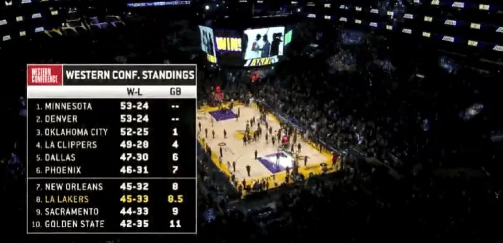 湖人在此役過後戰績變成45勝33負,排名升至西區第8。