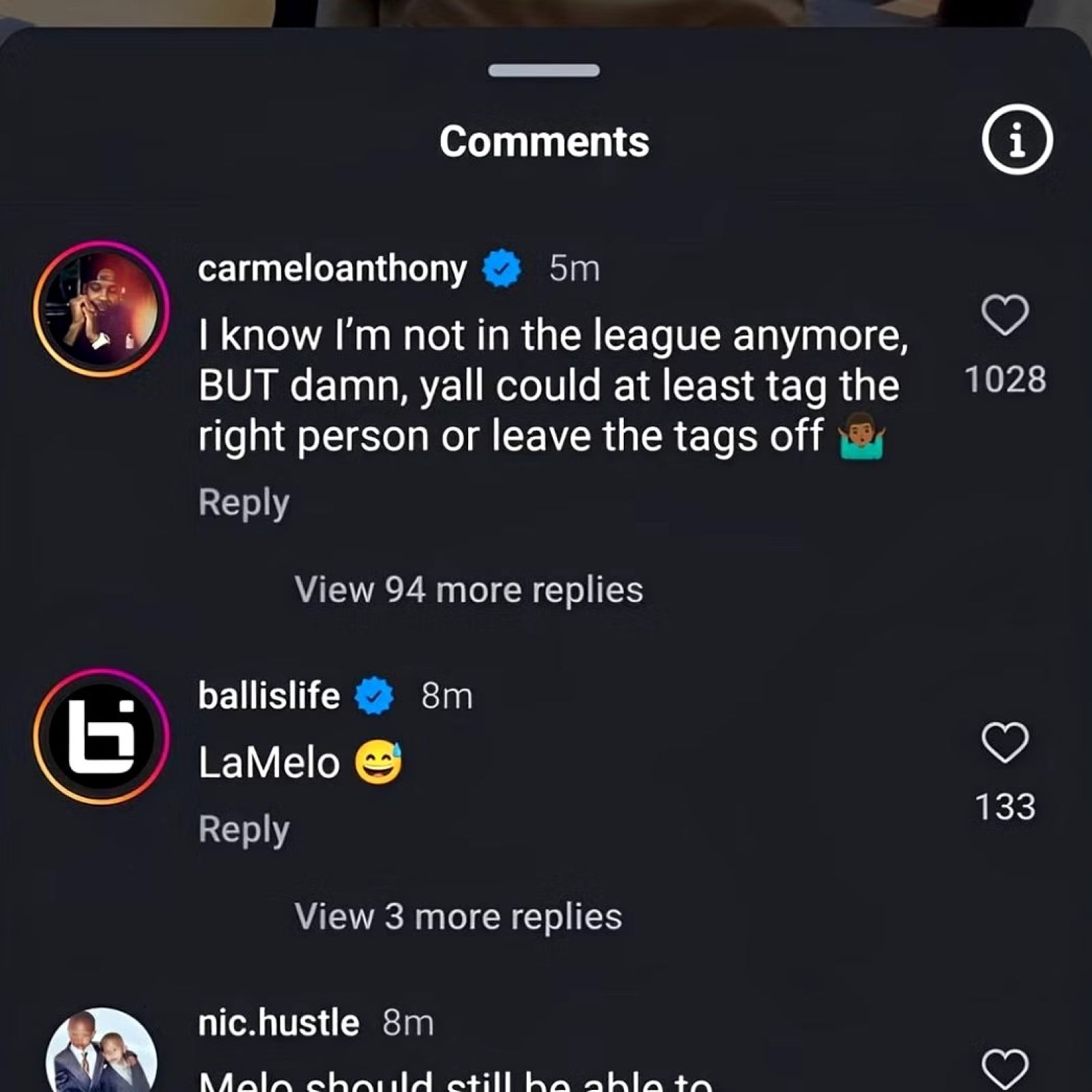 然而Carmelo Anthony隨後到這篇貼文留言說道:「我知道我已經不在聯盟了,但該X的,你至少可以標對人或是不要標啊」並搭配了攤手的表情符號,引來大家朝聖。