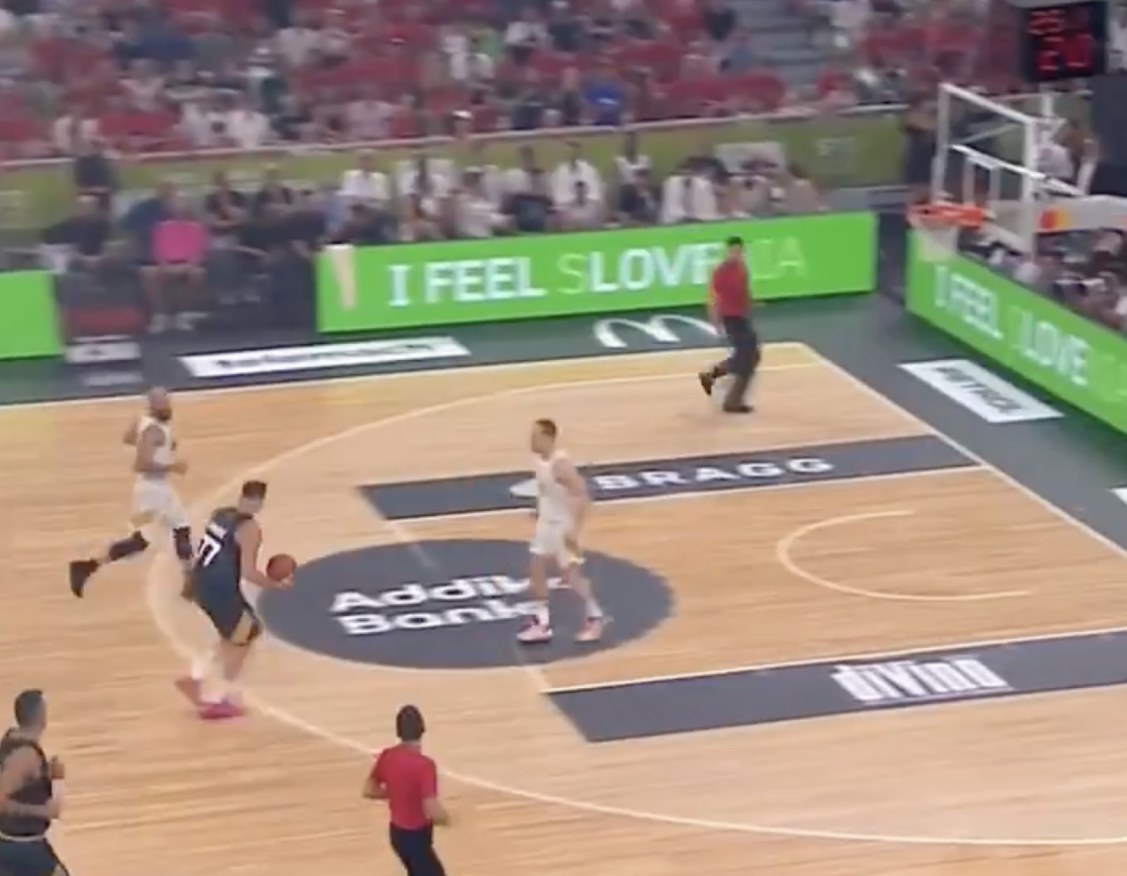 有一波的回合當中,他搶到了籃板,但搶籃板之前先推了對手一把,之後準備上籃時,看到對手只剩下一人,想要做花招但發現只有他一個人在進攻,他只好收球再次進攻。