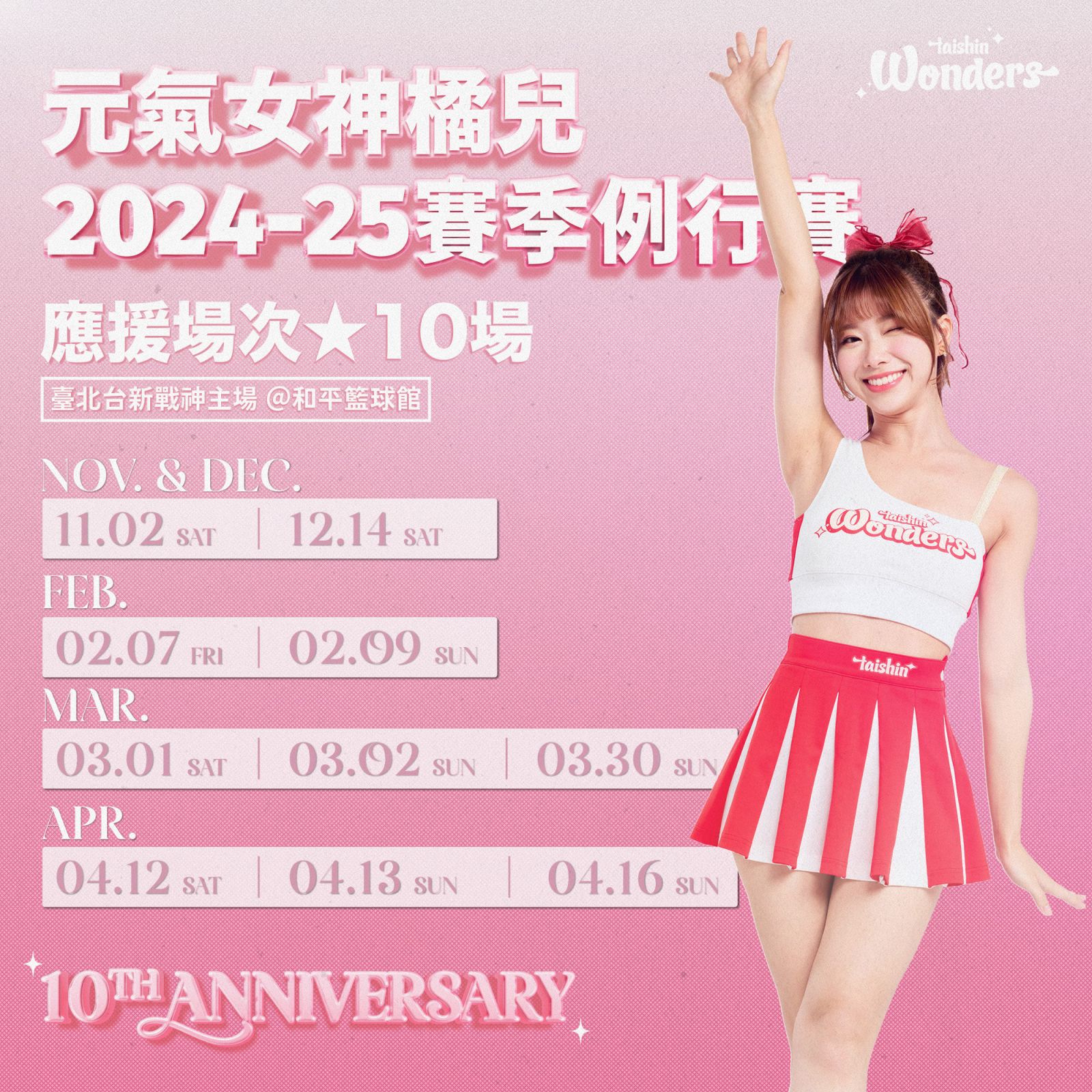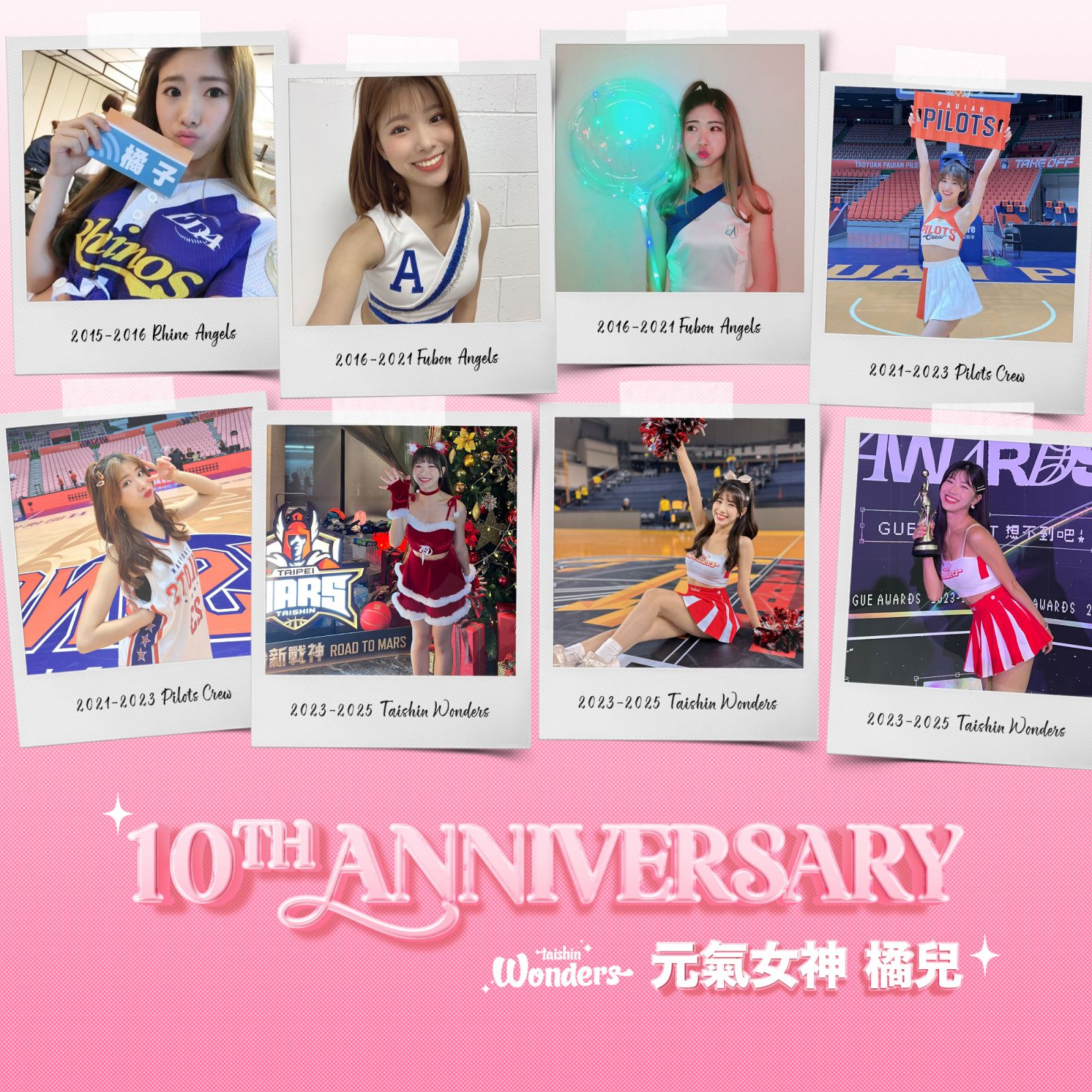 臺北台新戰神啦啦隊Taishin Wonders成員元氣女神橘兒,自2015年參與中職義大犀牛職棒啦啦隊徵選,開啟啦啦隊職業生涯,歷經義大犀牛啦啦隊Rhino Angels、富邦悍將啦啦隊Fubon Angels、桃園璞園領航猿Pilots Crew,於2023-24賽季加入Taishin Wonders,迄今邁入第十個年頭,今日橘兒宣布於新賽季達成十年里程碑後將退下啦啦隊身份,台新球團對此給予無限祝福,台新育樂總經理林祐廷表示:「感謝橘兒於團隊的付出,傳承個人經驗,帶領成員們成長,於場上也展現敬業態度,祝福她未來事業發展蒸蒸日上。」