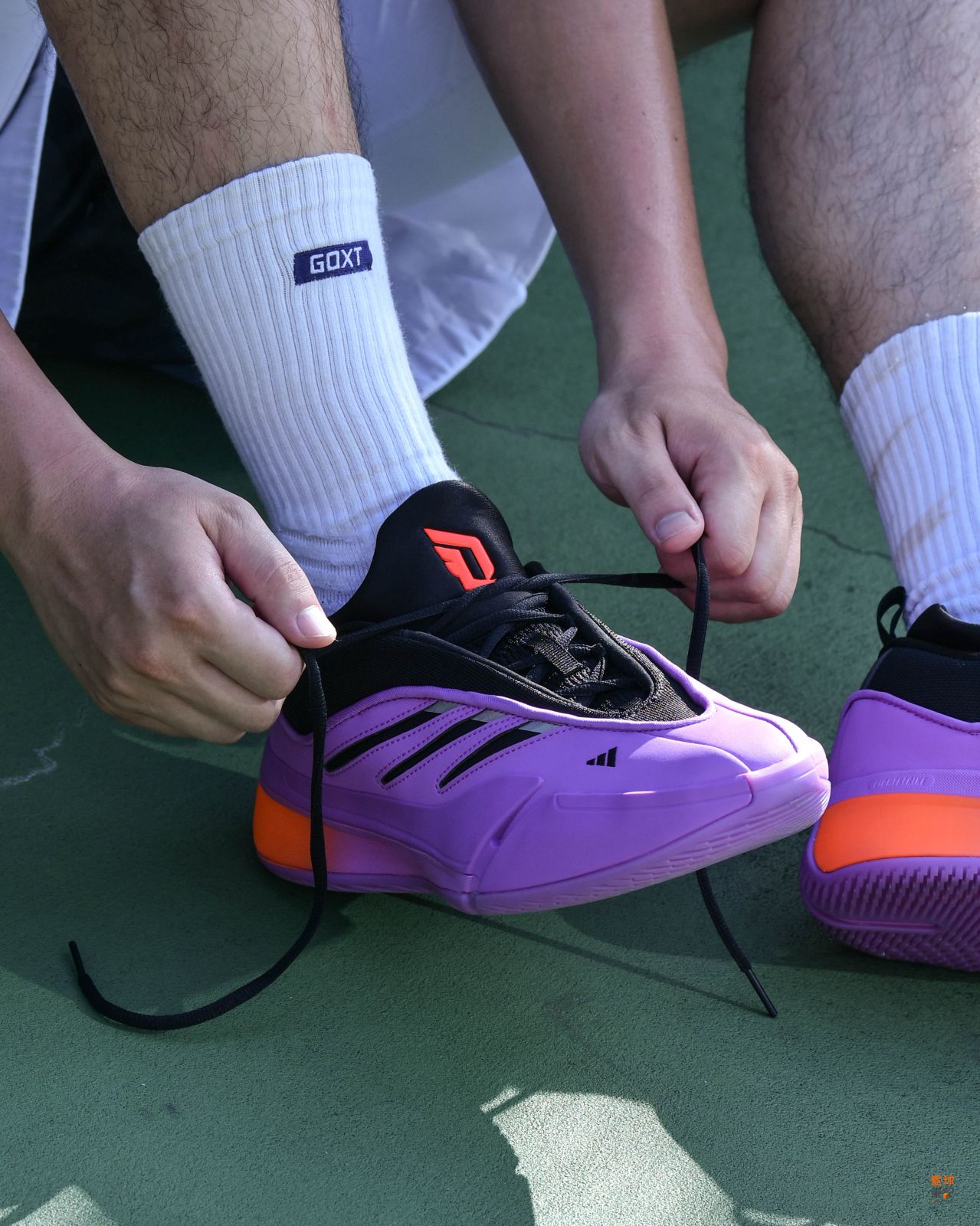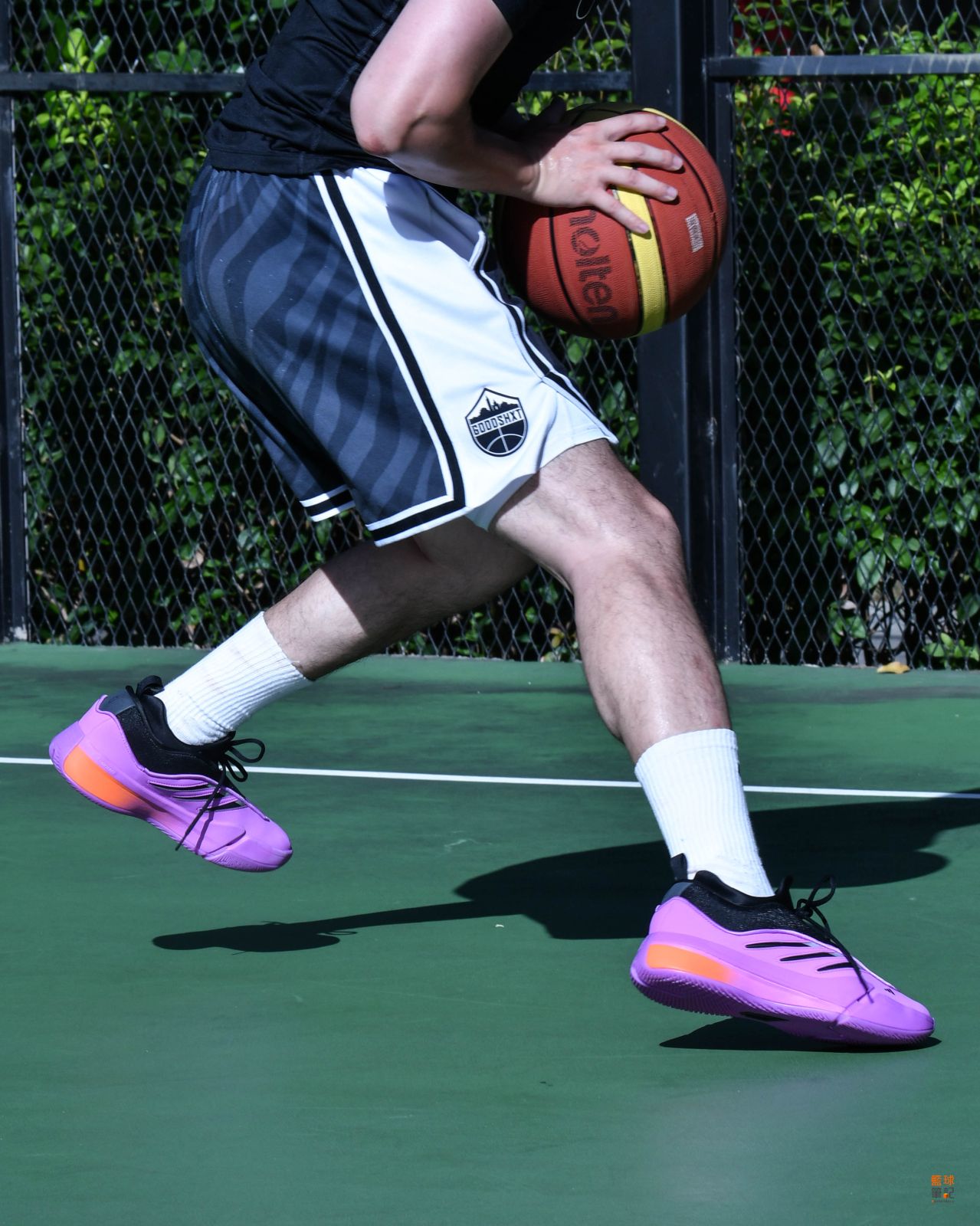 這次編輯所評測的鞋款式「LILLARD DAME 9」 "Purple Burst”,是adidas所上市的第一雙球鞋,整雙採以襪套式設計,腳的包覆感非常穩定實在,跳躍過程中給予球員強力的支撐。