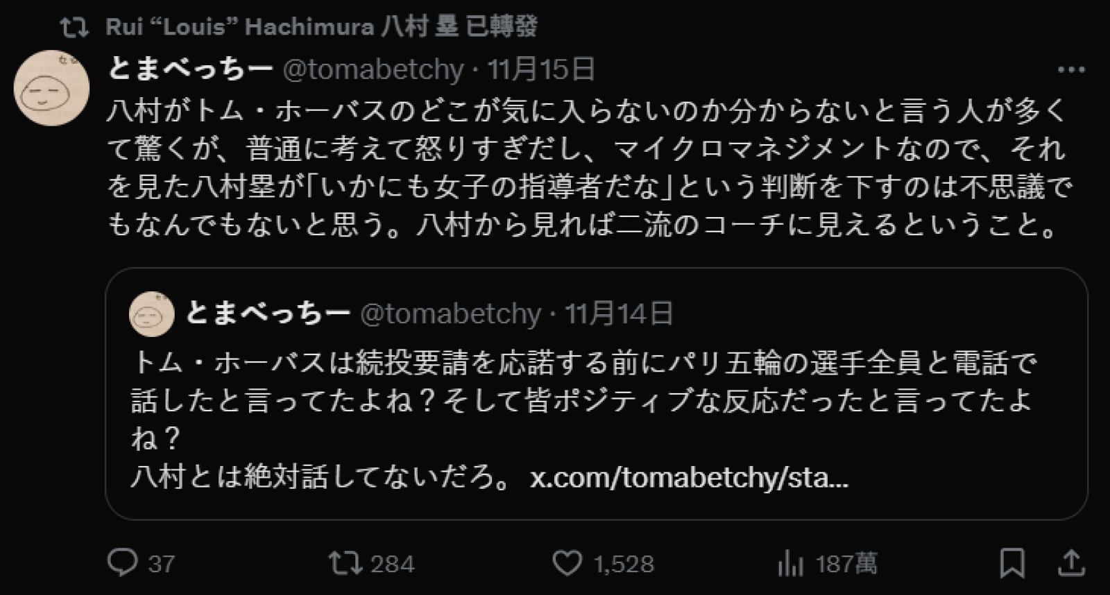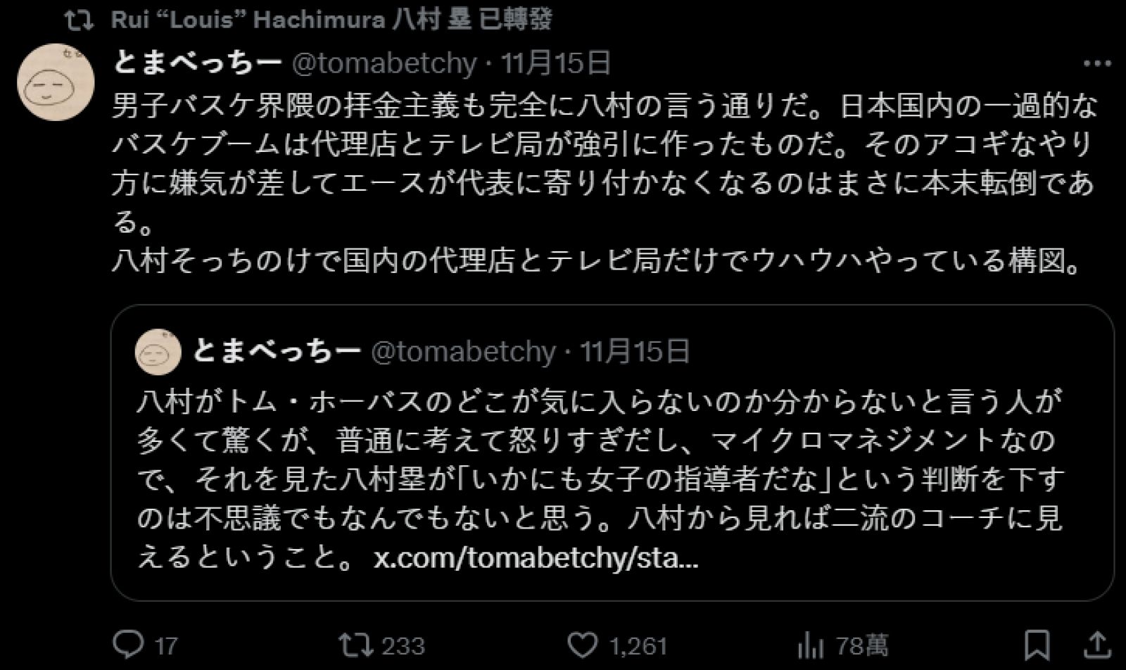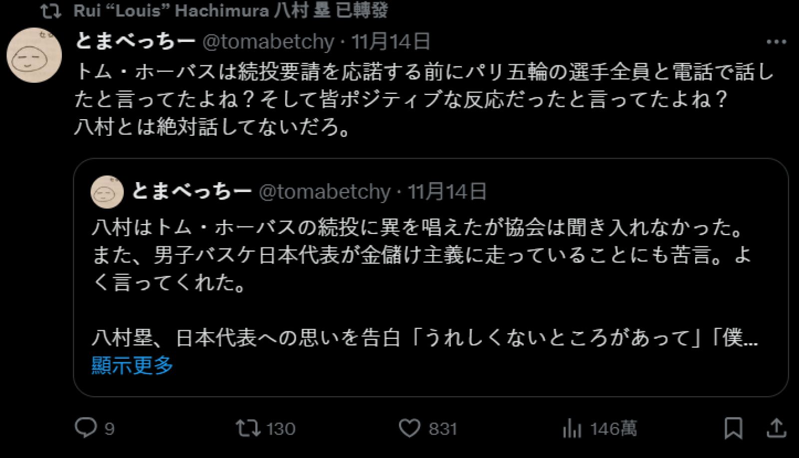 八村壘大部分皆轉發一名來自「とまべっちー」網友的言論,而以下為八村壘轉發的言論: