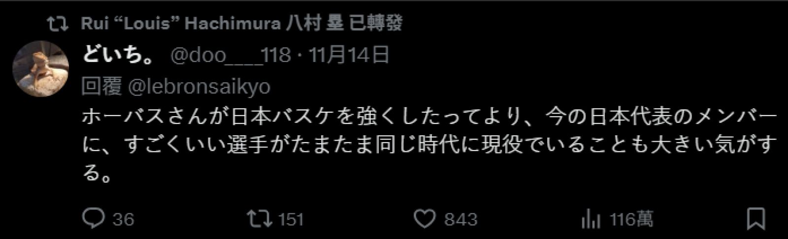 而八村壘也轉發了另一則網友的言論道: