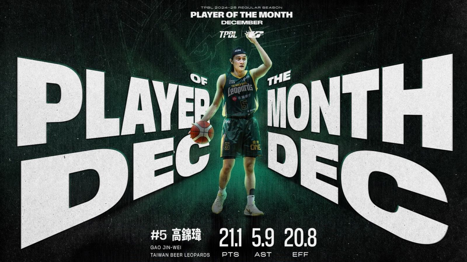 高錦瑋12月份場均21.1分、5.9助攻、4.6籃板、2.3抄截,效率值高達20.8,無敵數據甚至能比肩最佳外援候選者,穩定表現和對比賽的掌控力,讓他在26位專業媒體選票中,取得15張五分票,1668張球迷選票,加權後以總佔比33.5%,擊敗勁敵新北國王林書豪(30.8%)、李愷諺(11.4%)與陳懷安(9.5%),當之無愧地成為12月MVP,並為接下來的賽事奠定了更高的期望。
