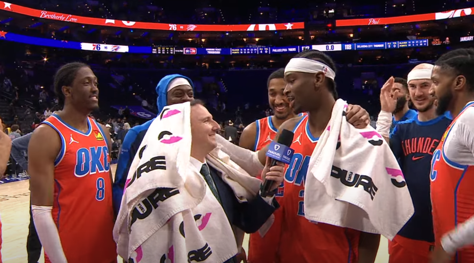 今天擊敗費城76人隊後,雷霆隊球員把這件事情推向新高度,在Gallo訪問SGA時,Jalen Williams拿著一堆毛巾,不斷將毛巾疊在Gallo的肩膀和頭上,同時將剩下的毛巾遞給旁邊的隊友。