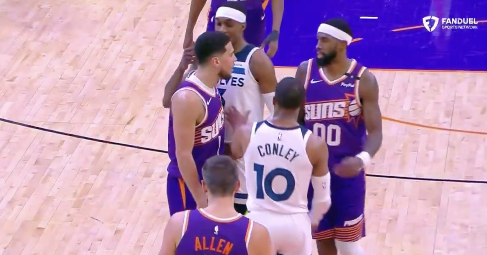 今日灰狼與太陽末節比賽最後時刻,Jaden McDaniels與Devin Booker互噴垃圾話,而在後續McDaniels直擊用手指Booker的頭,但Royce O’Neale、Anthony Edwards很快就上前把雙方拉開,衝突並未持續擴大。