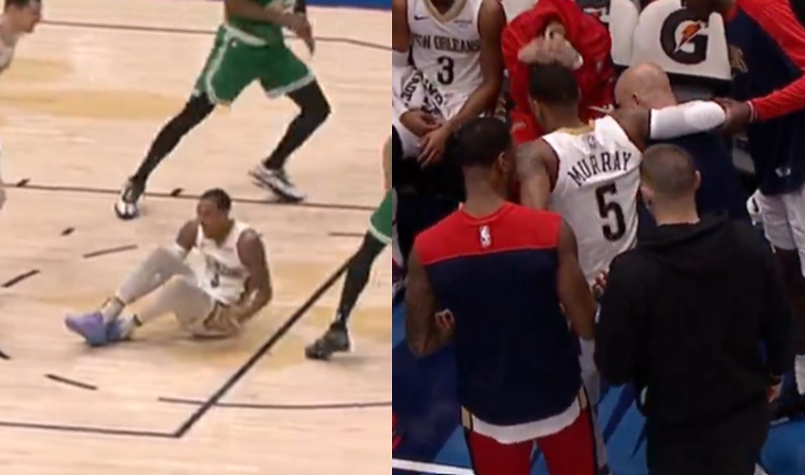 今日鵜鶘對陣塞爾提克的比賽中,Dejounte Murray在一次出手後爭搶籃板的過程中傷到了右腳,而這是一次無碰撞的傷勢,隨後他自己從場上單腳跳著離開,並在攙扶下進入休息室進行治療。