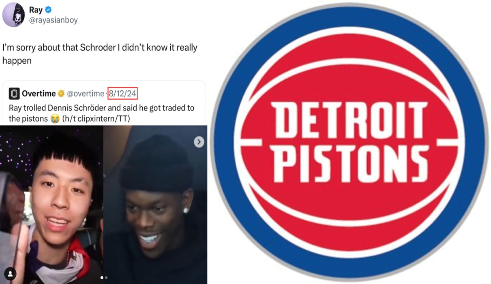 在最新交易中,Dennis Schroder再度被交易至活塞,Ray的玩笑正式成真,隨後也在社群向Schroder道歉。
