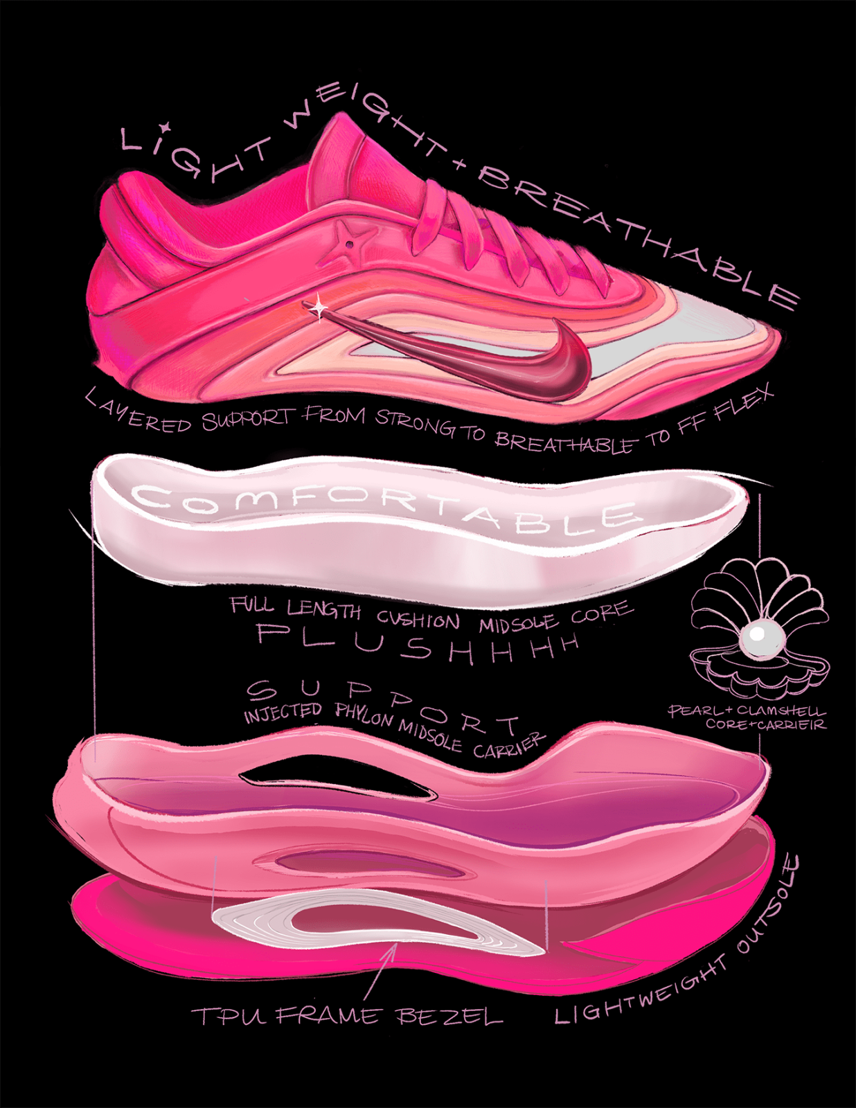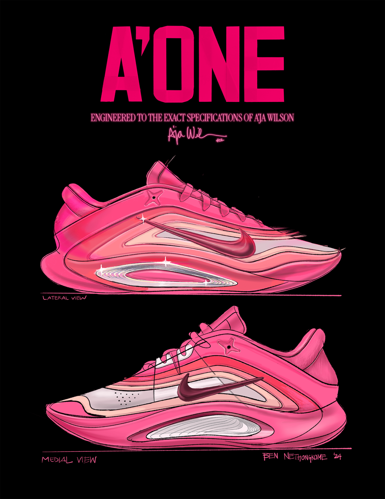 首發的Pink A'ura配色象徵A'ja Wilson充滿自信、忠誠,和激情的領導力,將她最喜歡的顏色用不同層次漸層展現,充滿了屬於獅子座的霸氣,用他最喜愛的顏色點燃整個球場。