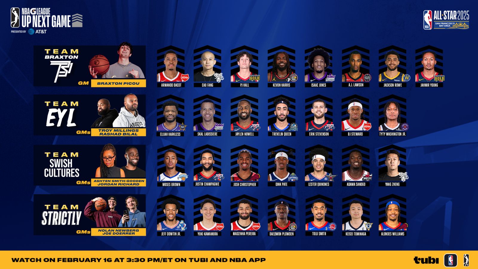 The teams are set for the #GLeagueUpNextGame presented by @ATT! Check out the results of the Draft as our Creator GM teams constructed the best squads of G League stars to compete at #NBAAllStar! Watch LIVE on Tubi on Feb. 16 at 3:30 PM/ET.