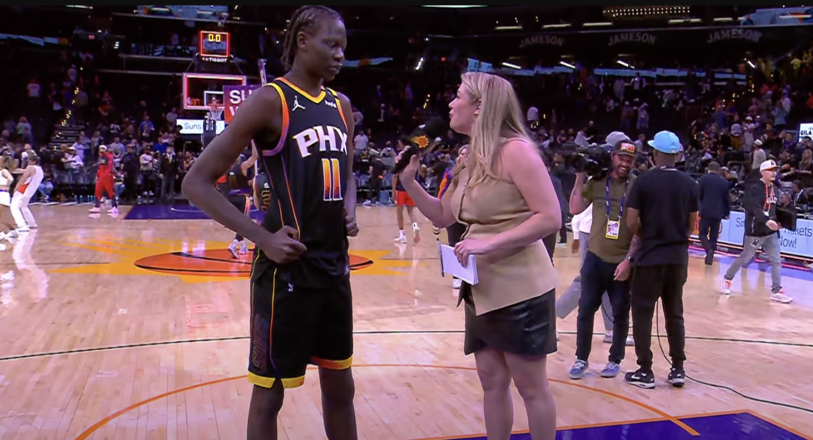 賽後太陽隊的電視記者Amanda Pflugrad找上Bol Bol進行訪問,卻因為他們兩個之間的身高帶來了一場有趣的場邊花絮。