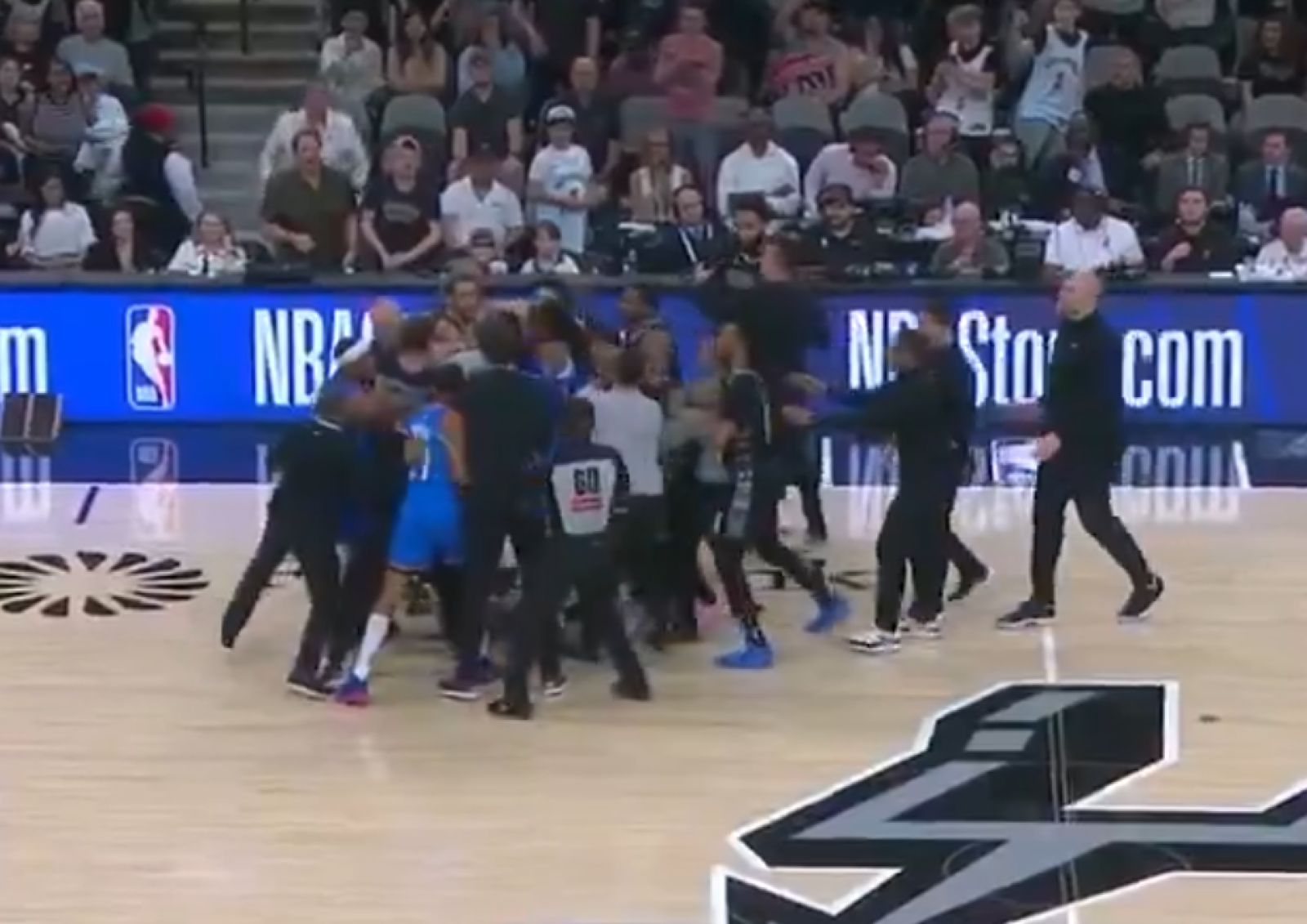 今日雷霆與馬刺的比賽中,馬刺在一次進攻中Jeremy Sochan從底線跟進完成灌籃的同時,靠近中場的Julian Champagnie與Kenrich Williams發生衝突,隨後衝進人群的Jeremy Sochan與Luguentz Dort也開啟了第二波衝突。