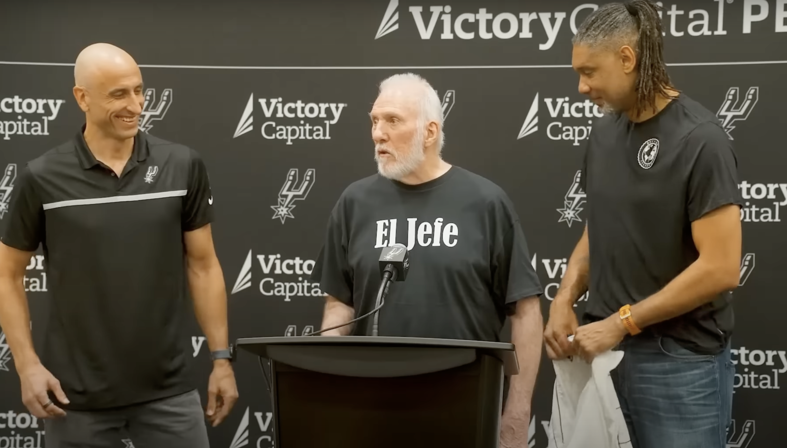 今天的記者會中,他還甚至帶了兩位過去的球員,站在他旁邊就像是保鑣一樣,分別是Manu Ginóbili和Tim Duncan,他們還相當細心地站在Popovich旁邊,還幫Popovich拿了他的外套。