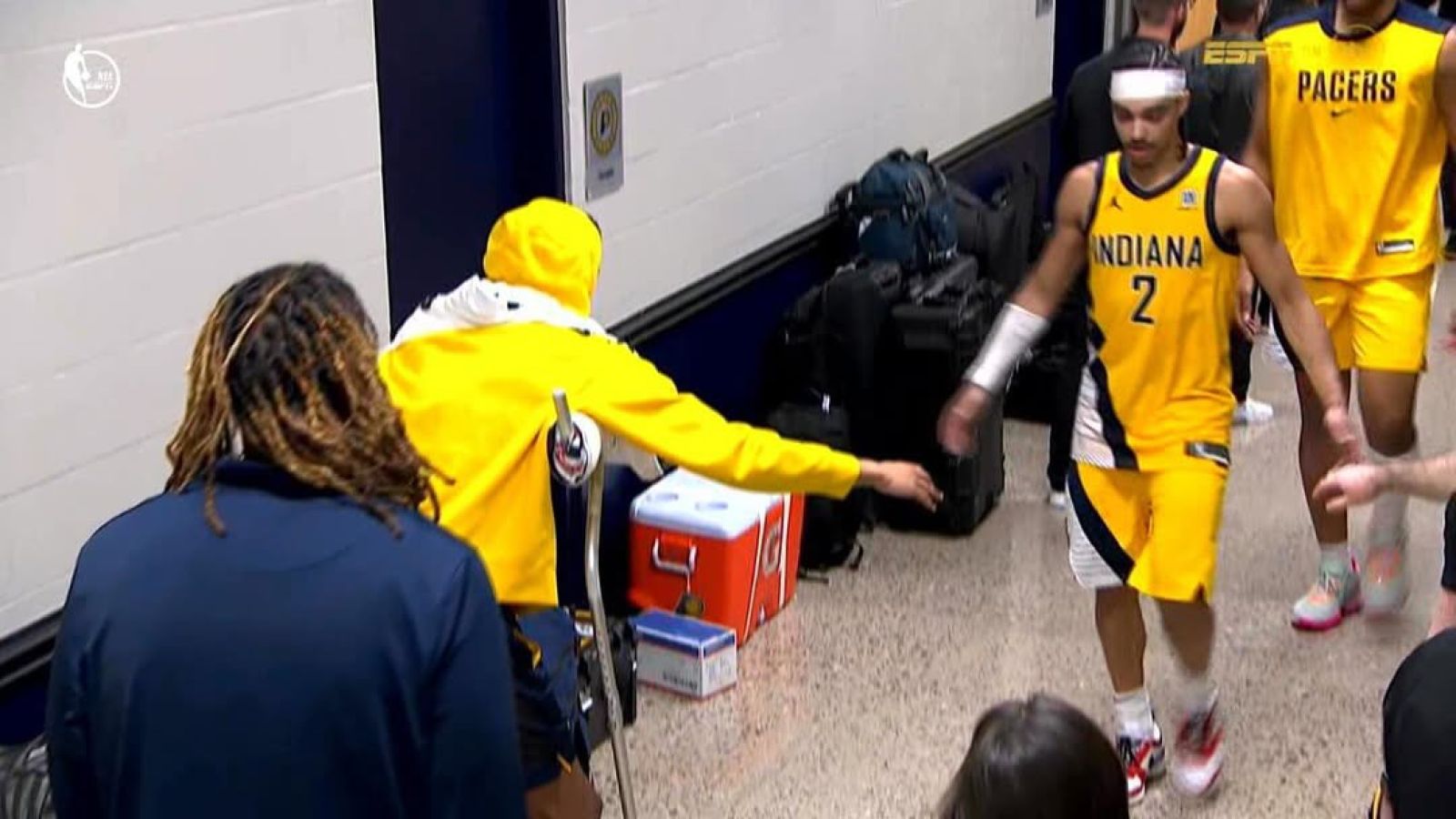 今日溜馬在搶七大戰中不敵雷霆,系列賽大比分以3-4無緣拿下本賽季總冠軍。而在比賽中因阿基里斯腱傷退的Tyrese Haliburton,在賽後仍拄著拐杖,留在球員通道中與拼搏整場返回休息室的隊友們擊掌打氣。