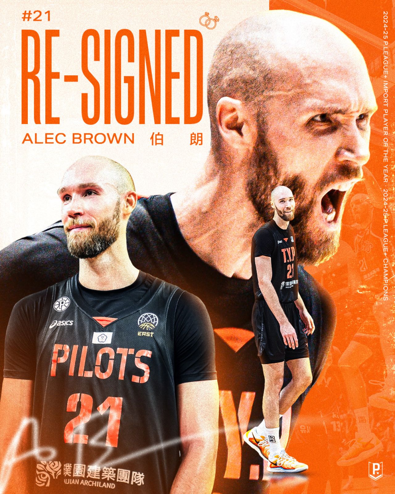 桃園璞園領航猿今宣布與2024-25賽季PLG年度洋將伯朗(Alec Brown)完成續約,雙方簽訂二年合約,未來二年將持續攜手征戰亞洲各國,誓言在下個賽季完成連霸。