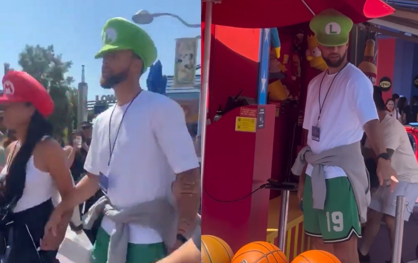 NBA休賽季往往是球星們能多陪伴家人、休息的時刻,而Stephen Curry近期也被捕捉到帶著家人前往好萊塢環球影城遊玩,享受一年當中難得的休息時刻。其中妻子Ayesha戴著瑪利歐帽子、Curry則戴著路易吉帽子,一同陪伴女兒Riley遊玩樂園。