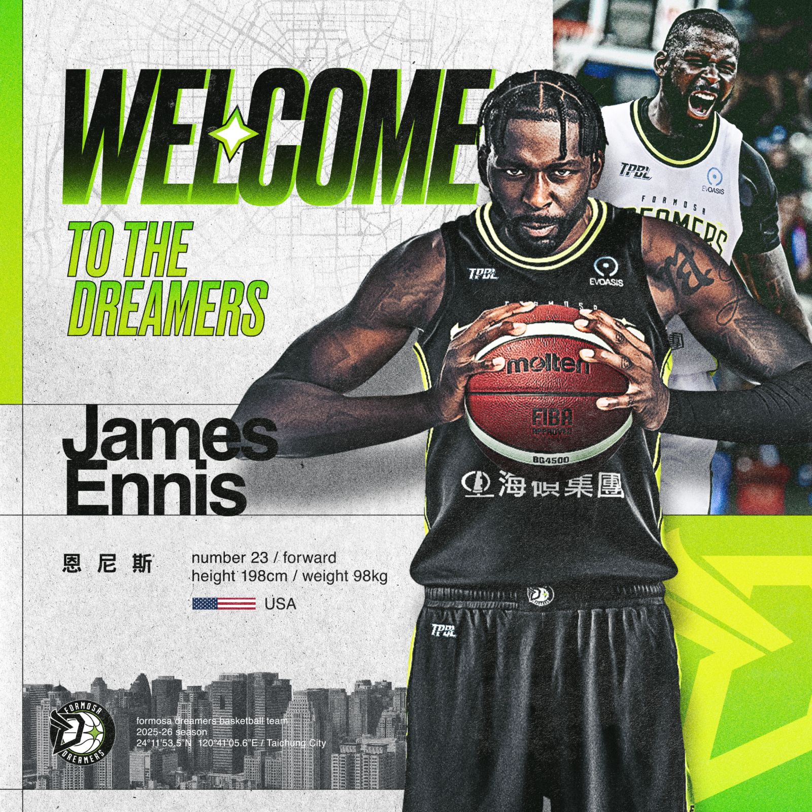 福爾摩沙夢想家今(30)日正式宣布,簽下豐富資歷的戰將詹姆斯・恩尼斯(James Ennis),現年35歲,身高201公分的恩尼斯,擁有超過10年職業經驗,橫跨美國、澳洲、波多黎各、巴林、中國、以色列、俄羅斯與日本等多國聯賽。