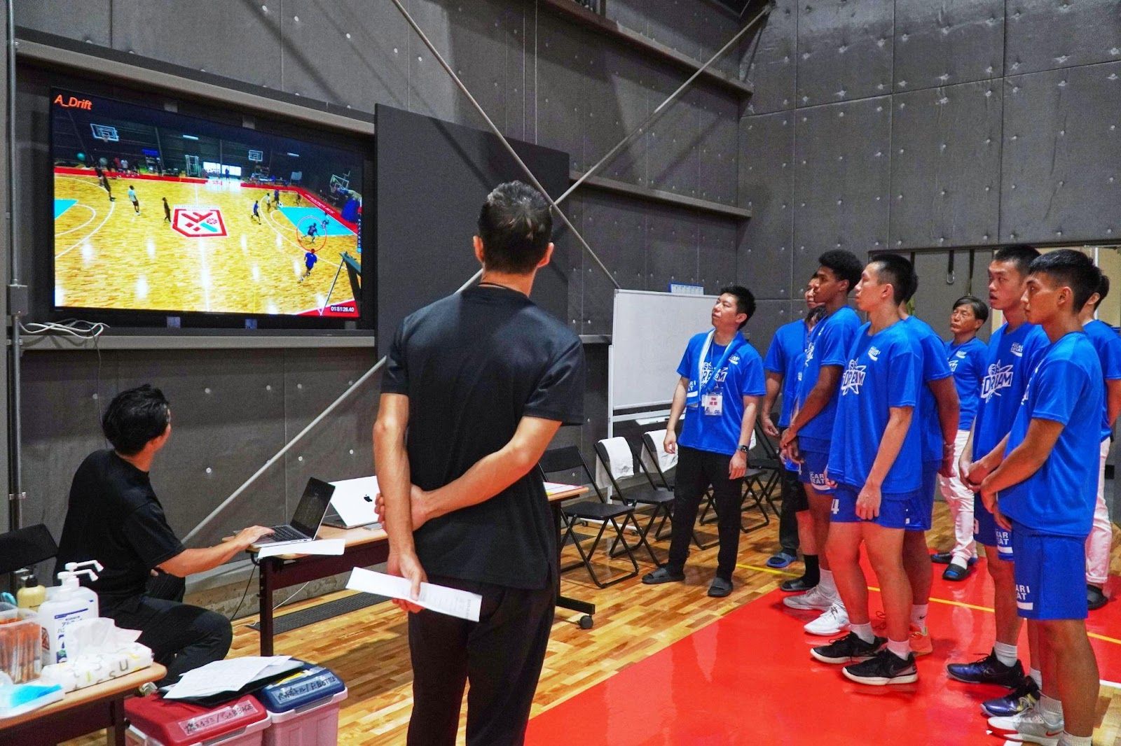 廣島蜻蜓隊教練團在訓練空檔利用即時影像,快速講解新星隊們在跑位細節需注意的地方。圖/籃球筆記