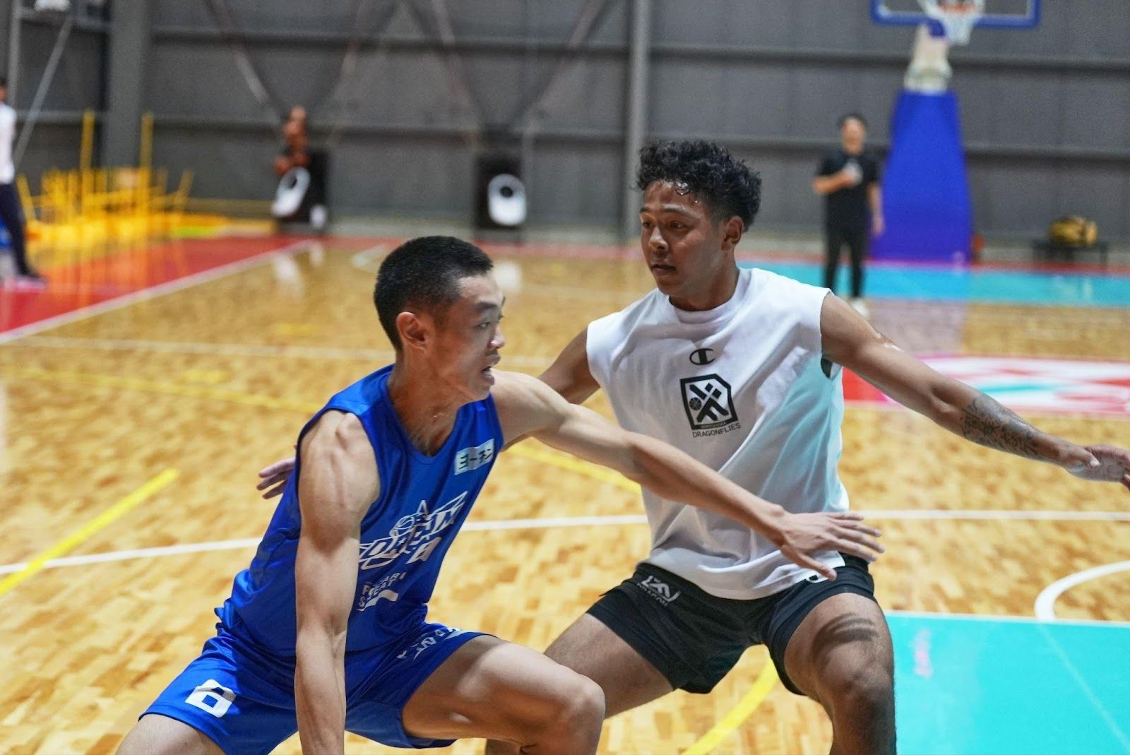 新星隊隊員(東泰高中-能得勝)與廣島蜻蜓隊球員Nick Mayo進行對抗交流。圖/籃球筆記