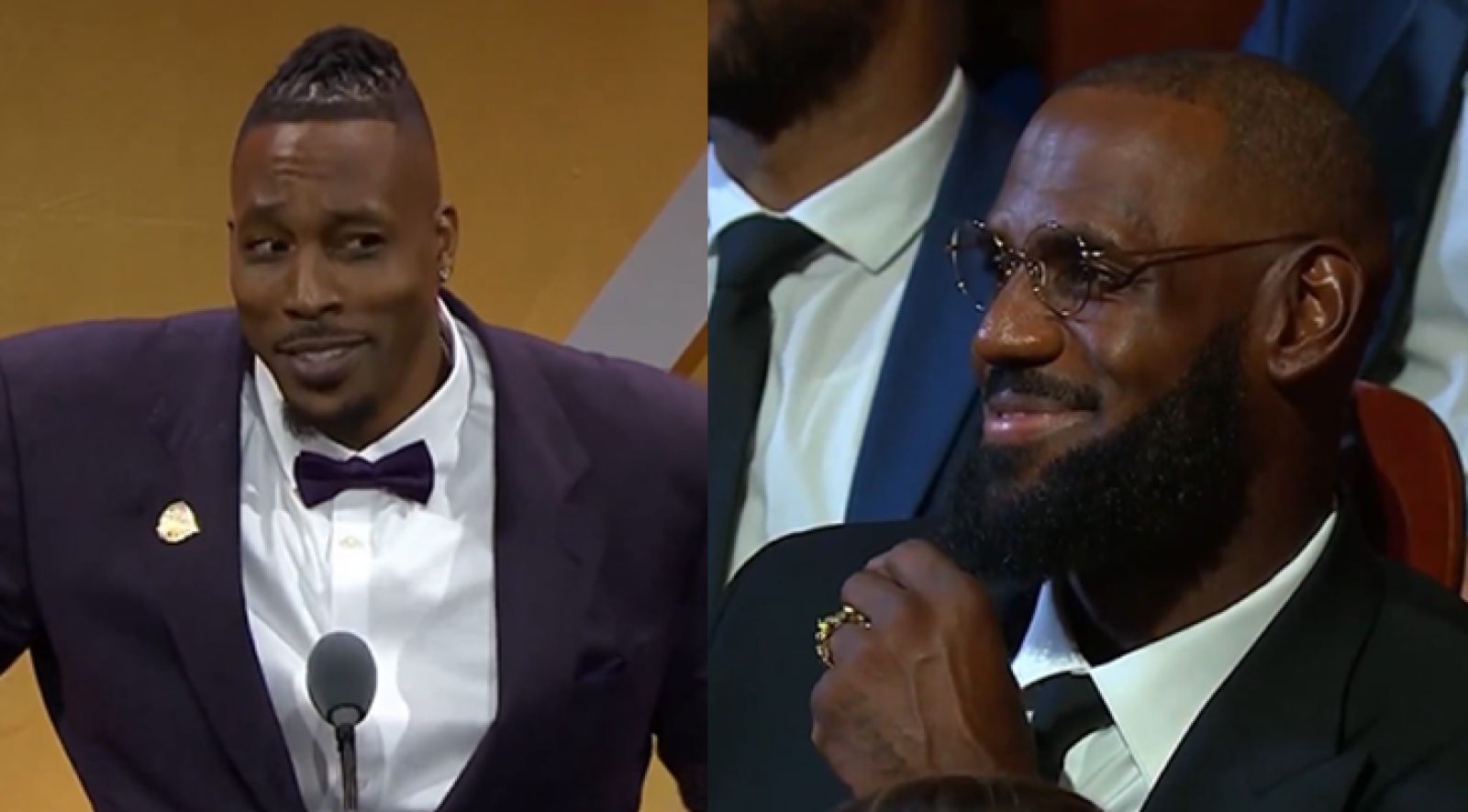 「我的籃球之旅把我帶到了洛杉磯,這是我NBA之旅的最後一站。所以我想大聲喊出來,我是不是把這裡面的怪獸吵醒了?Lakers Nation就在這棟樓裡。」隨後鏡頭帶到了在場觀禮的LeBron James,Howard也注意到台下的LeBron James,並向這位未來的名人堂球星打招呼:「喔LeBron也在這裡!喔!LeBron James到場了!好的,謝謝你來,兄弟!」現場觀眾隨即爆出更大的歡呼。