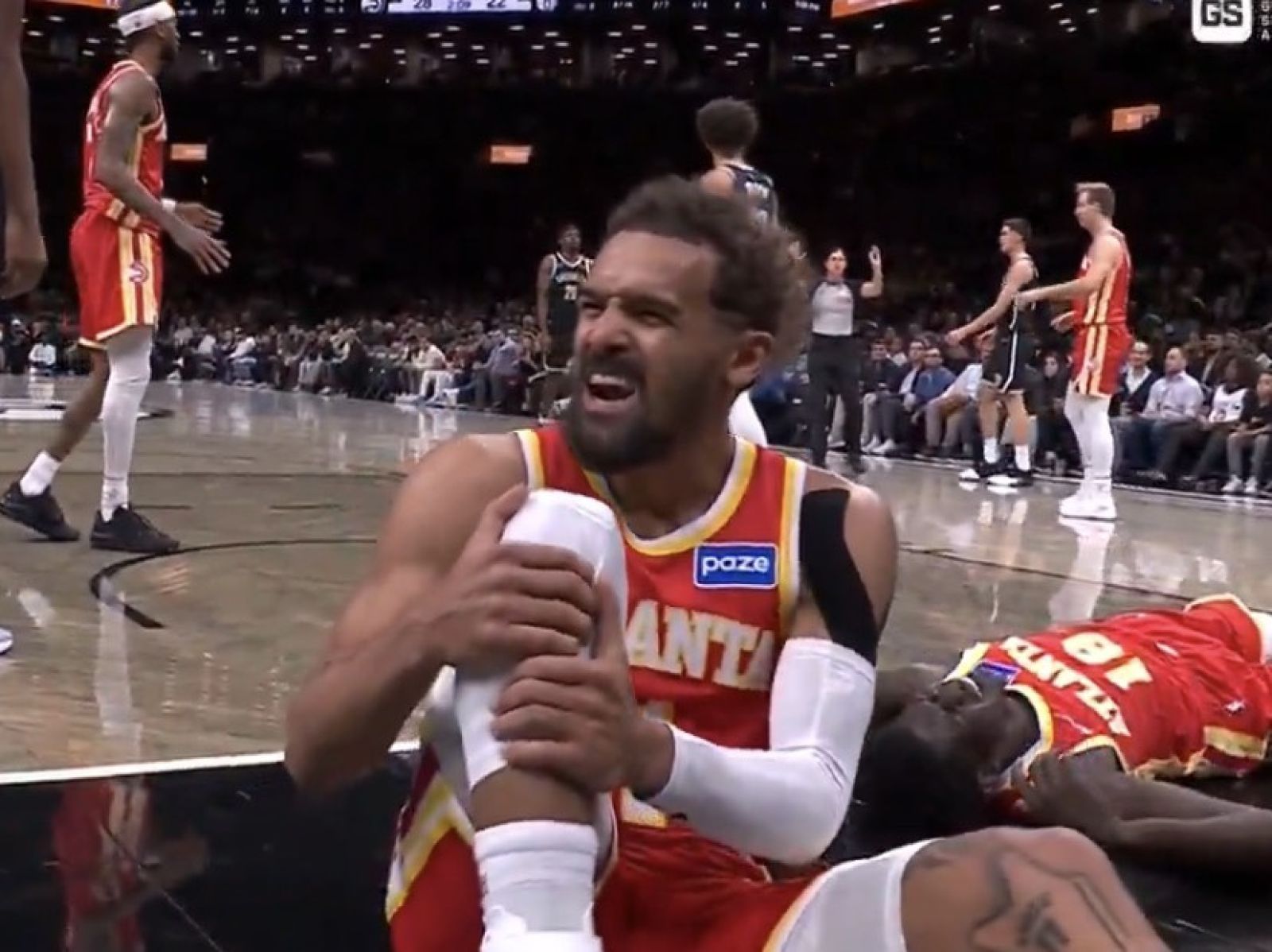 今日老鷹與籃網的比賽中,Trae Young的右腳在籃網 一次進攻中被隊友Mouhamed Gueye壓到,後續Young也因此跌坐在地露出痛苦神情。