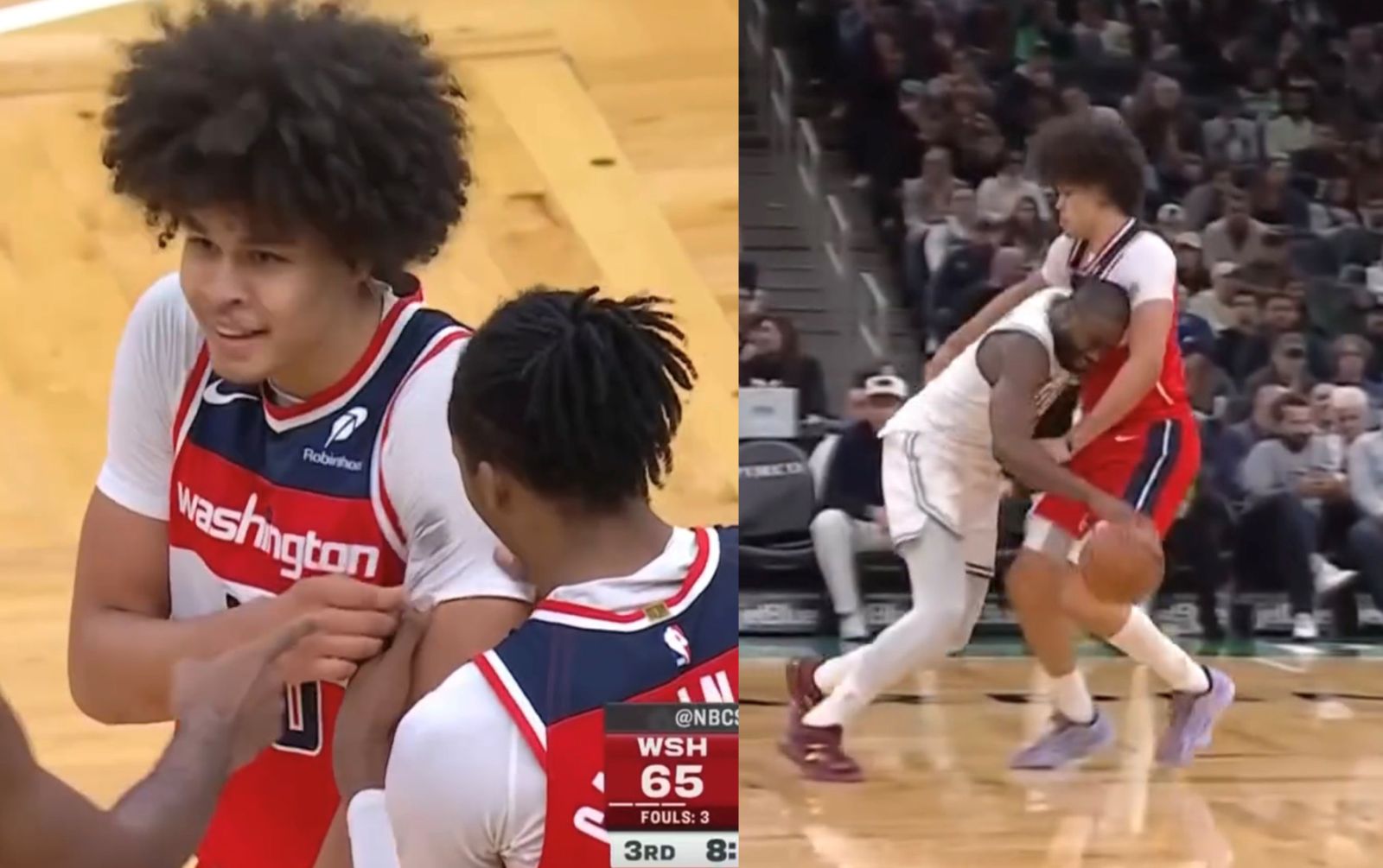 今日塞爾提克以136-107擊敗巫師收下比賽勝利,然而比賽中出現了另一個插曲。Jaylen Brown在一次進攻中頭頂到了防守他的Kyshawn George,結果他的「髮線」抹到了George的白色束衣上,對此George也在檢查這束衣上的髒污到底是什麼來頭。