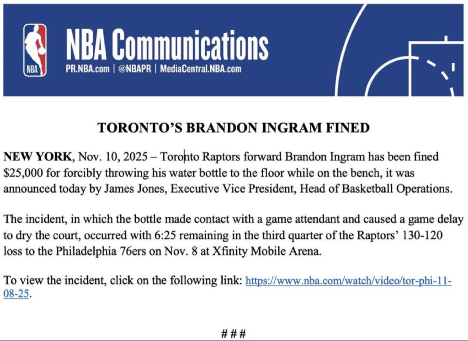 先前暴龍對陣七六人的比賽中,Brandon Ingram於板凳上怒砸水瓶波及到工作人員與比賽暫停,瓶內的水也噴濺到了包括攝影師和暴龍隊隊友 Scottie Barnes 在內的多人身上,而今日NBA官方宣布將針對此行為對Ingram罰款25,000美元。