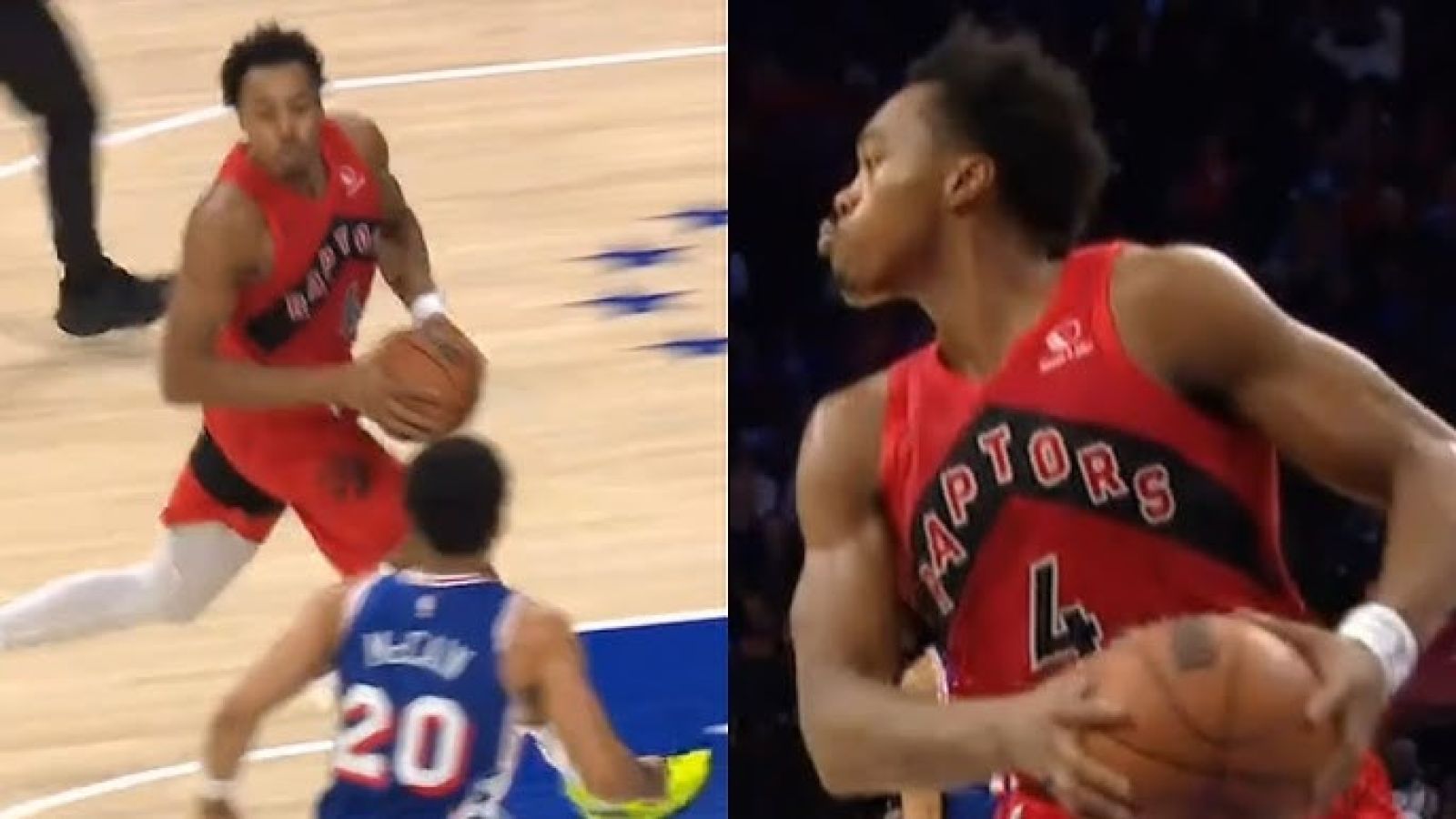 在第三節的最後幾分鐘,多倫多隊還有一個精彩的扣籃鏡頭,來自 Scottie Barnes。在 Jamal Shead 從 VJ Edgecombe 手中抄截得球後,他將球拋給 Barnes,後者衝入禁區,在將球扣下之前,對著 Jared McCain 送出了一個飛吻。