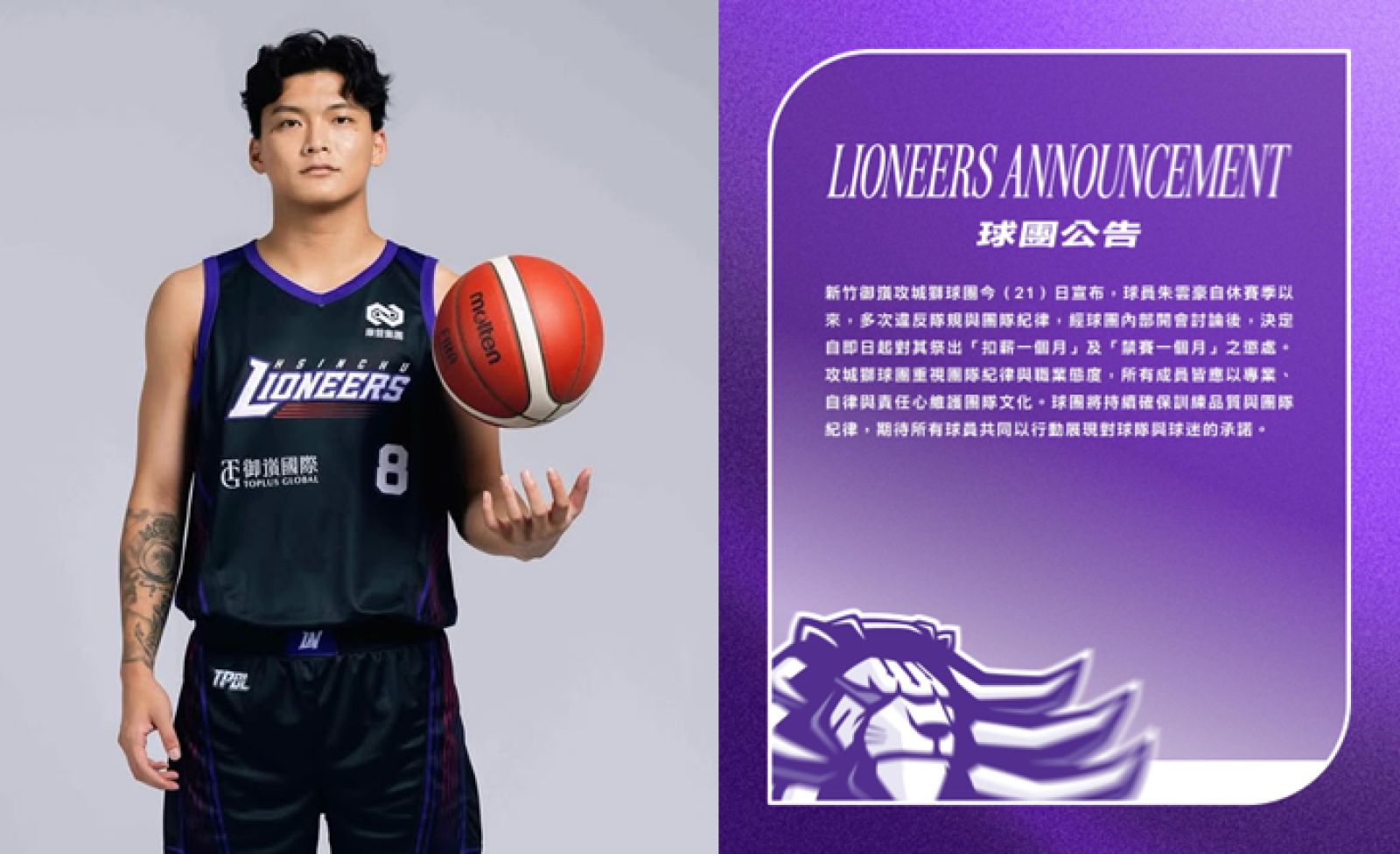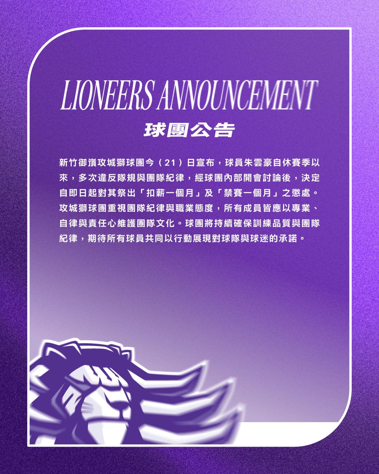 新竹御嵿攻城獅球團今日宣布,球員朱雲豪自休賽季以來,多次違反隊規與團隊紀律,經球團內部開會討論後,決定自即日起對其祭出「扣薪一個月」及「禁賽一個月」之懲處。