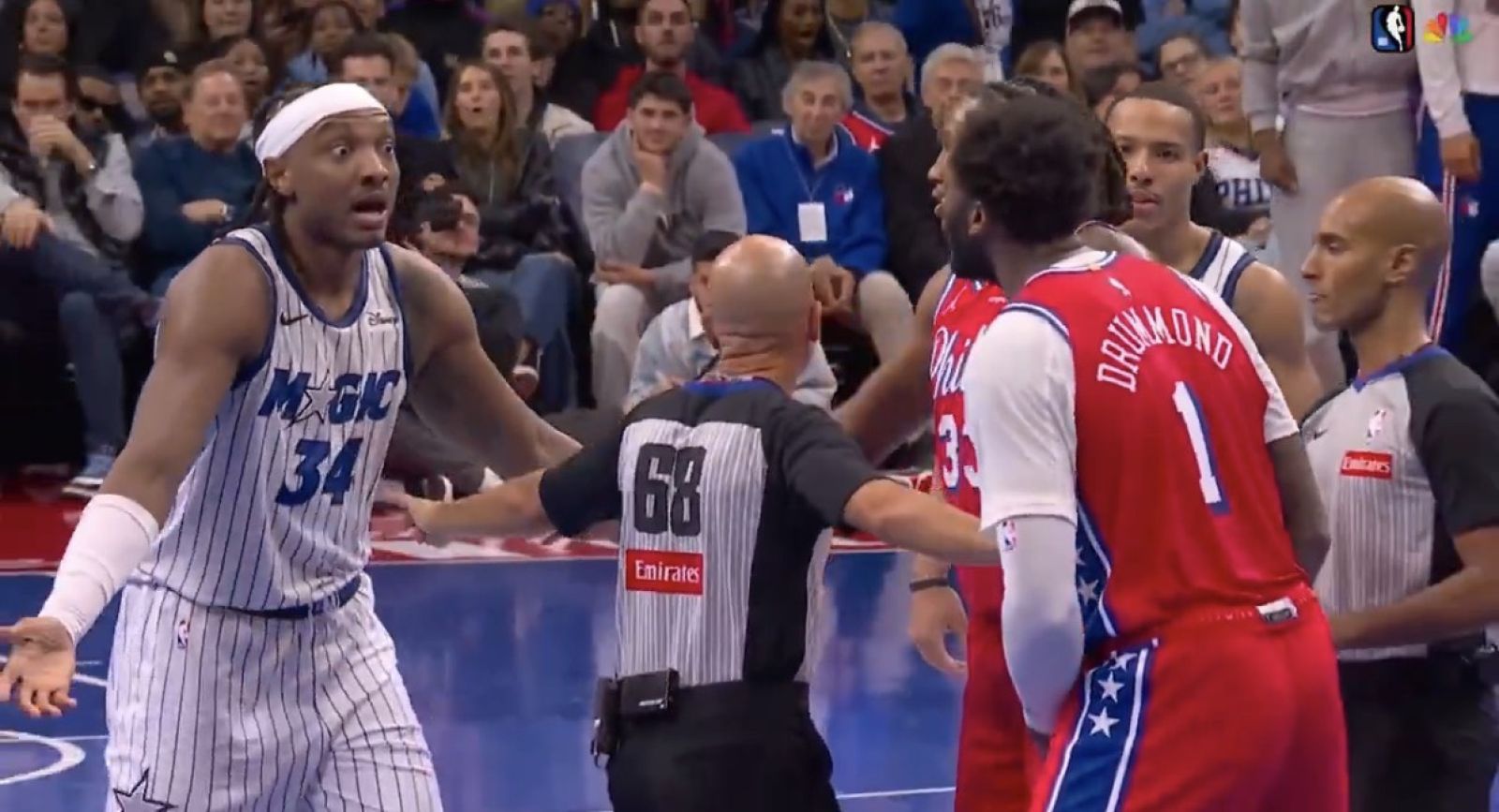 今日魔術與七六人的NBA盃賽事中,,比賽進行到第二節時魔術已經取得了大幅領先,然而至第二節最後的讀秒時刻Wendell Carter Jr.與Andre Drummond在魔術進攻中因彼此推擠爆發衝突,後續Jalen Suggs也隨之加入戰局,雙方衝突進一步擴大。