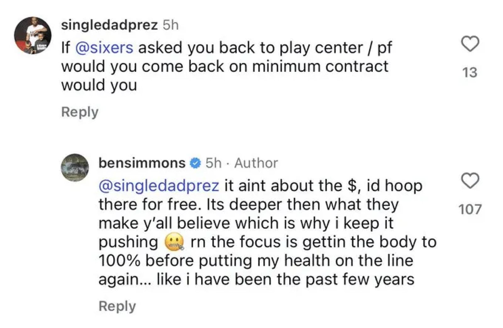 Ben Simmons則對此回覆道:「這跟錢一點關係都沒有,我願意免費為他們打球。事情比外界讓你們相信的要複雜得多,所以我只能繼續往前走。現在最重要的是把身體恢復到100%,在再次冒著健康風險之前…過去這幾年我已經那樣做得太多了。」