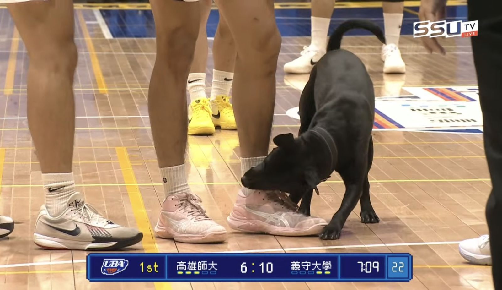 今日114學年度UBA公開男子組一級賽事持續於虎尾科技大學進行,而在高雄師大對陣義守大學的首節比賽進行至七分鐘時,場邊突然有隻狗衝進場內,緊鄰在高雄師大球員蔣杰紘身邊並緊咬他的鞋子不放,後續在謝玉娟教練以及主持人林志彥協助下將狗從球場帶離,比賽才得以繼續。
