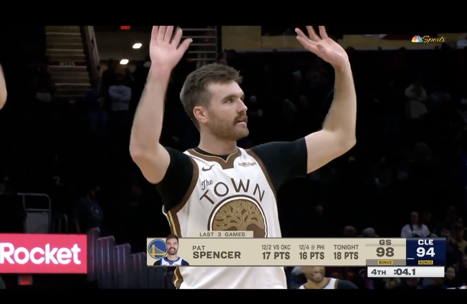 在這場比賽中,Pat Spencer 在他的職業生涯首次先發中,創下了個人生涯最高的 19 分,在比賽倒數時刻,Spencer向騎士主場球迷揮手,示意他們可以提早回家了,因為勇士勝局已定。