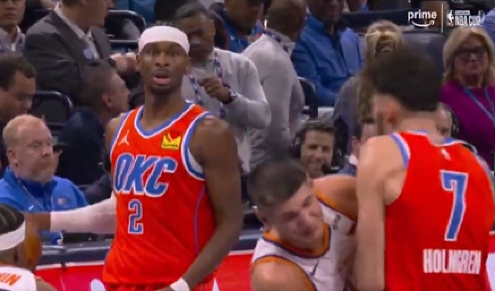 後續雙方都被各自隊友拉開,而Jalen Williams在衝突發生後隨之慶祝並鼓譟全場球迷,Shai Gilgeous-Alexander則是在衝突爆發當下露出驚恐表情,成為另類焦點。