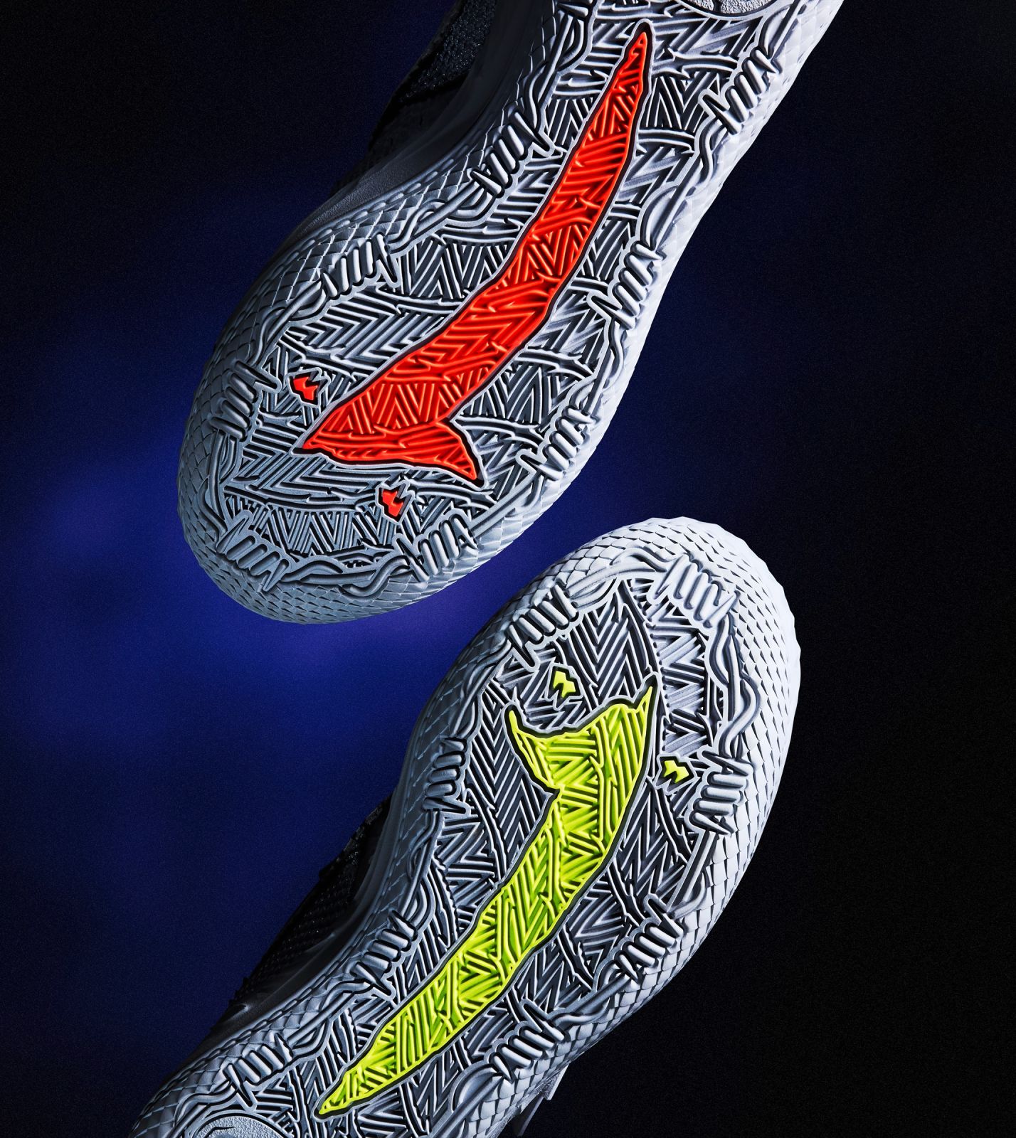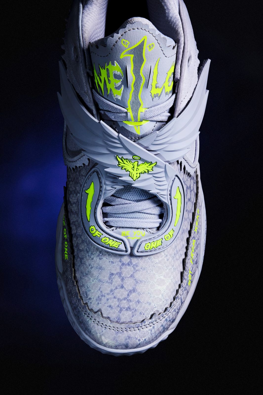 MB.05 Metallic以大面積金屬銀打造強烈存在感,一眼就能辨識的未來感視覺。螢光綠與亮紅色的霓虹細節,呼應 Melo「1 of 1」的獨特能量,呈現專屬於他的張力與個性。鞋舌、後跟到大底皆延續 Melo DNA 概念,打造立體骷髏頭、象徵「1」的標誌性元素,讓整雙鞋的設計層次更鮮明、更有識別度。