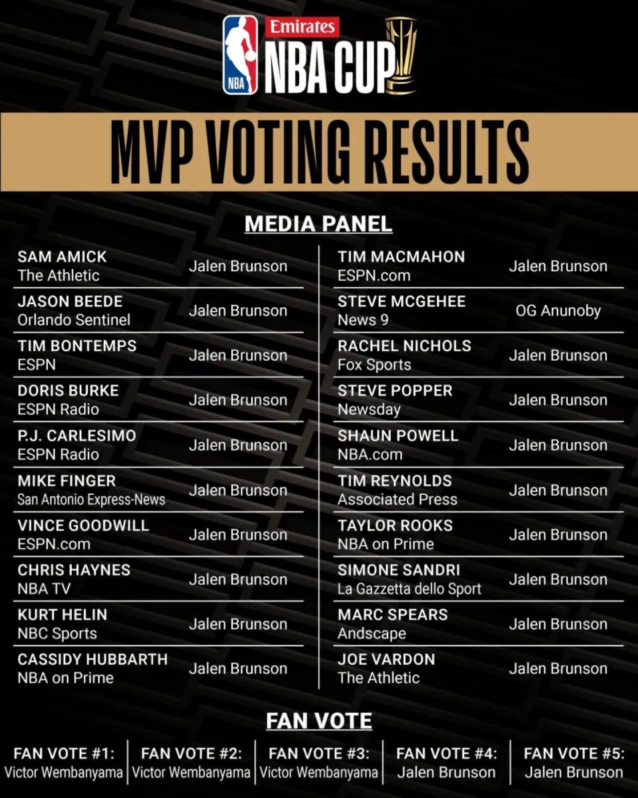 今日NBA盃冠軍賽最終由尼克以124-113擊敗馬刺奪冠,而賽後NBA盃的MVP票選也出爐,20張媒體投票中最終結果為Jalen Brunson獲得19票、OG Anunoby獲得1票,由Jalen Brunson獲得此殊榮。