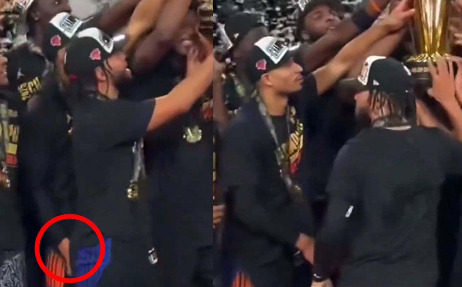 Josh Hart於舉盃時偷摸Jalen Brunson臀部。圖/截自推特